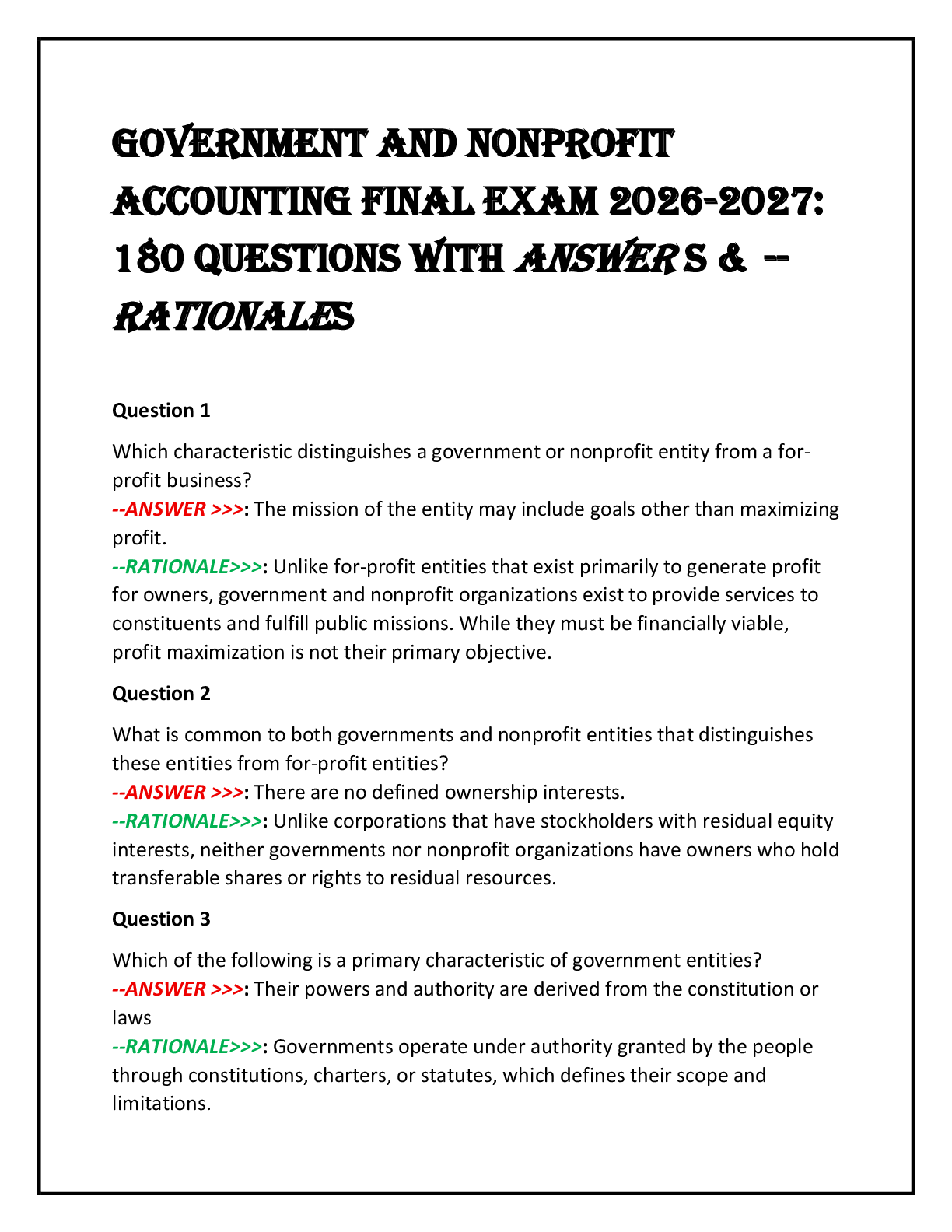 *NURSING > FINAL EXAM > Government and Nonprofit Accounting Final Exam 2026-2027: 180 Questions with ANSWER s & --RATIONALEs