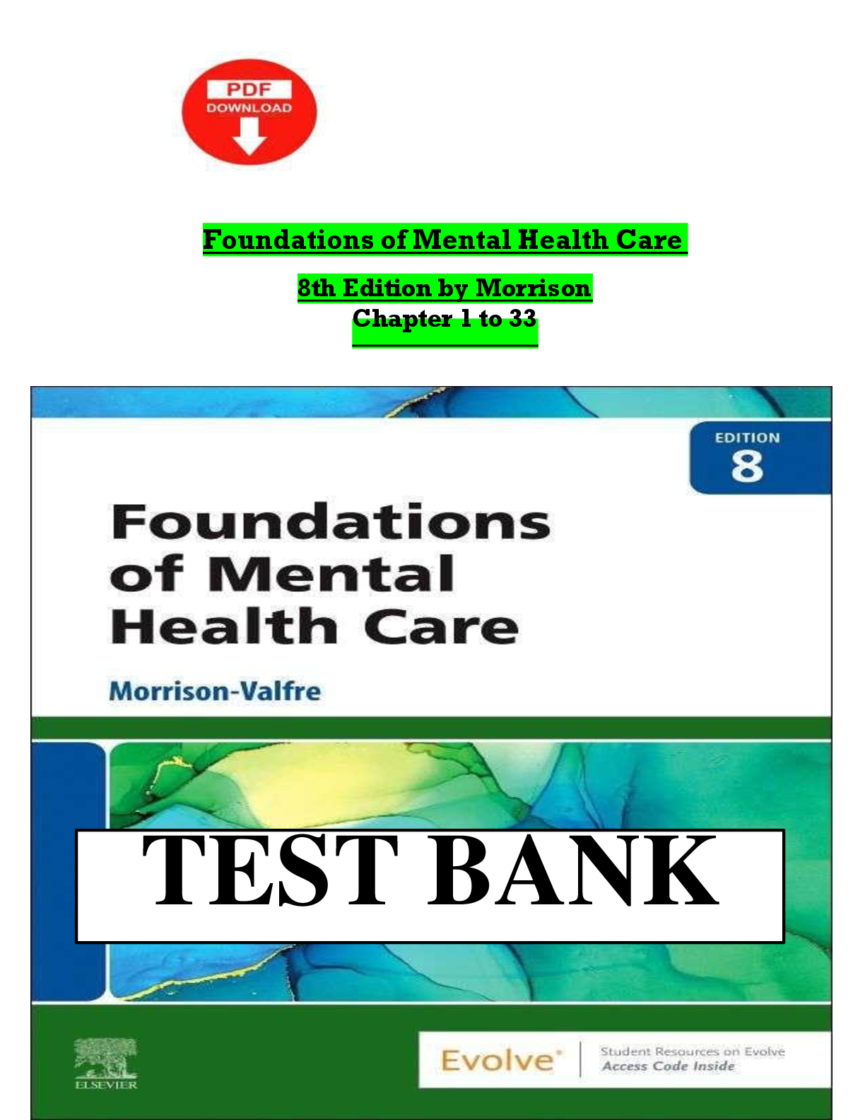 PSYCHIATRIC MENTAL HEALTH NURSING > TEST BANKS > Test Bank for Foundations of Mental Health Care, 8th Edition by Michelle Morrison-Valfre | ISBN: 9780323811460 | Complete Chapters 1-33 | Q&A | NCLEX-PN® Style | Downloadable PDF