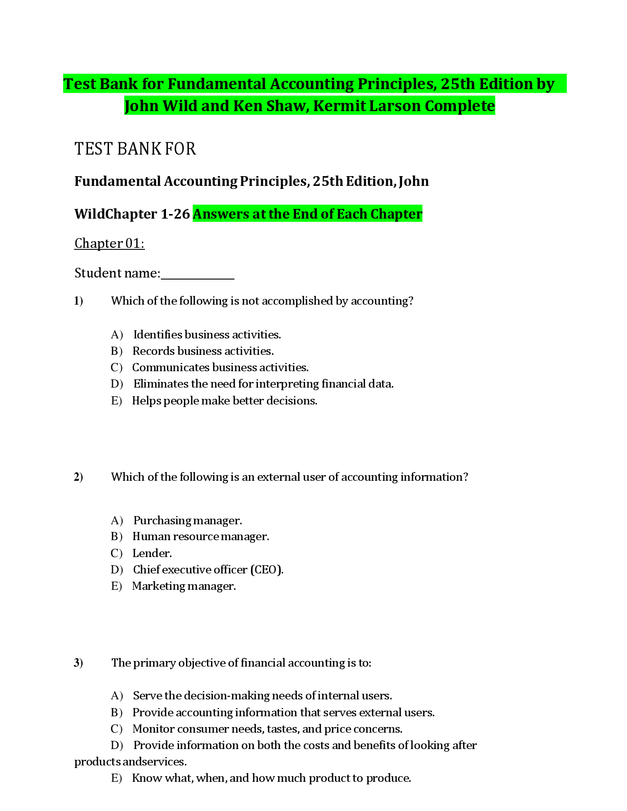 Accounting > TEST BANKS > Test Bank for Fundamental Accounting Principles, 25th Edition by John Wild, Ken Shaw & Kermit Larson | ISBN: 9781260780208 | Chapters 1-26 | Multiple Choice Questions with Answers | Downloadable PDF