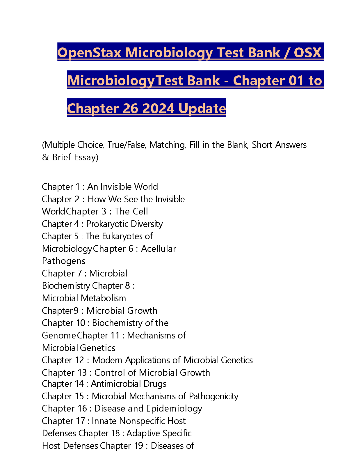 Microbiology > TEST BANKS > Test Bank for Microbiology by OpenStax, 1st Edition by Parker, Schneegurt, Tu, Lister & Forster | ISBN: 9781938168147 | Complete Chapters 1-26 | Downloadable PDF