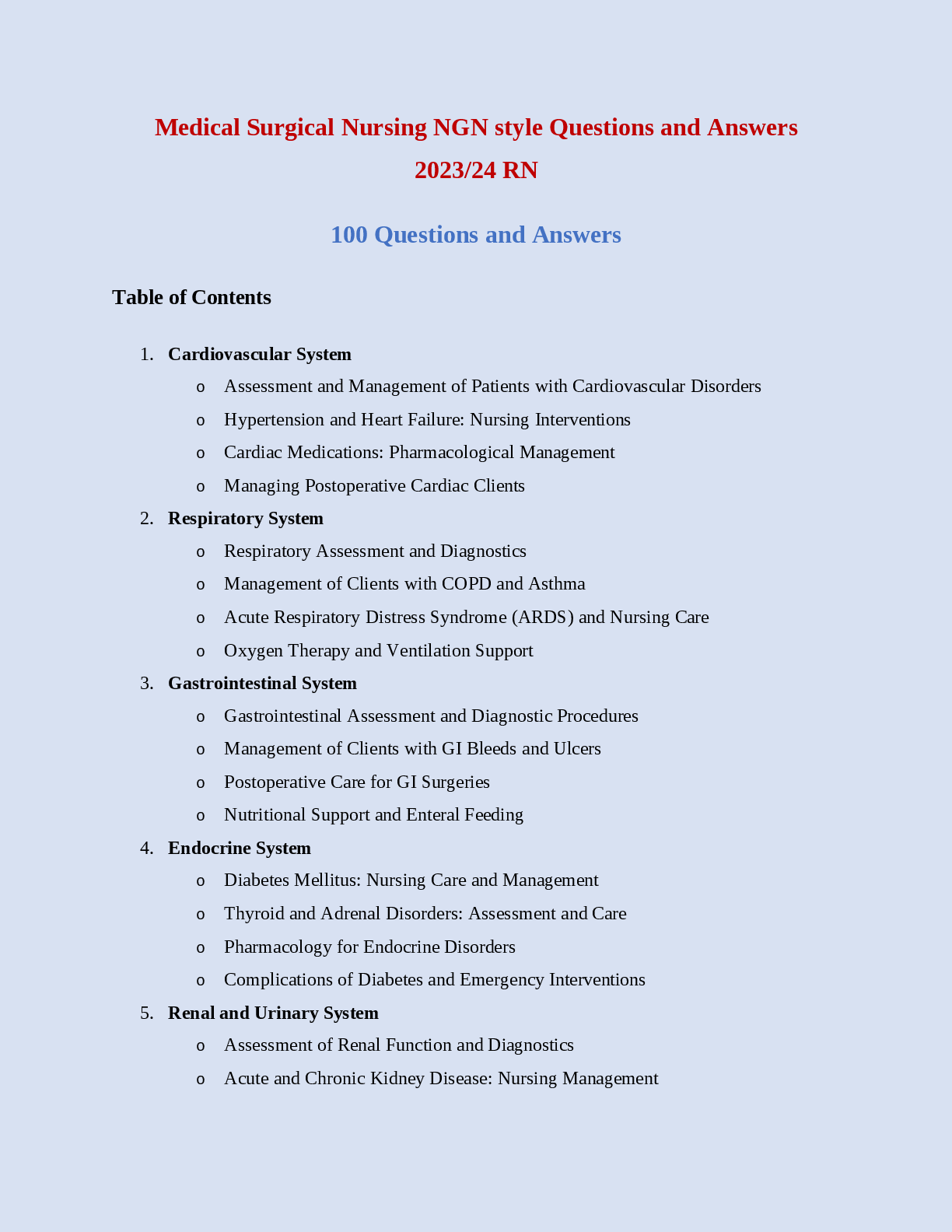 *NURSING > EXAM > Medical Surgical Nursing NGN style Questions and Answers 2023/24 RN 100 Questions and Answers