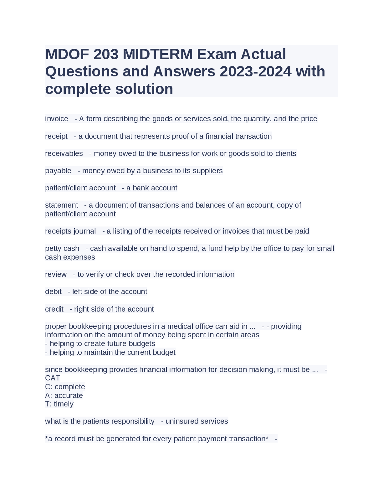 *NURSING > EXAM > MDOF 203 MIDTERM Exam Actual Questions and Answers 2023-2024 with complete solution