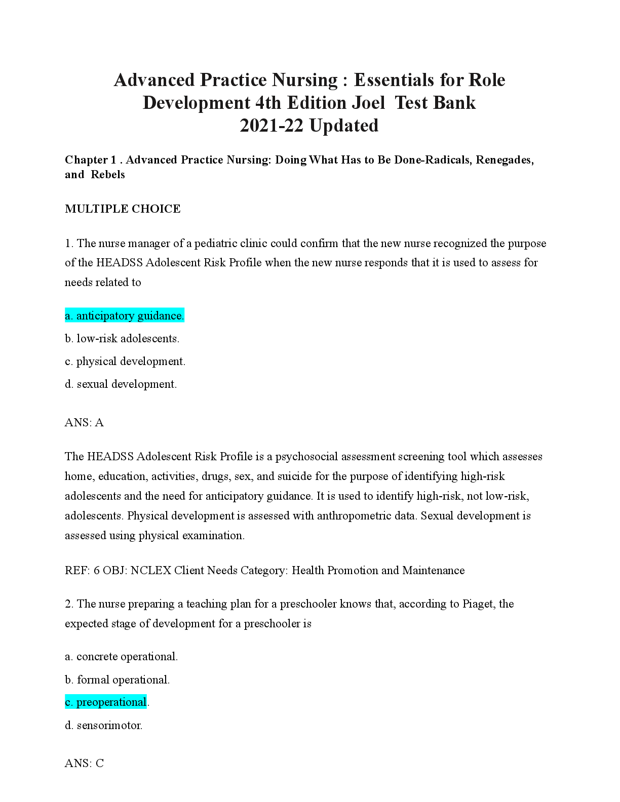 *NURSING > QUESTIONS and ANSWERS > Advanced Practice Nursing : Essentials for Role Development 4th Edition Joel Test Bank LATEST Updated