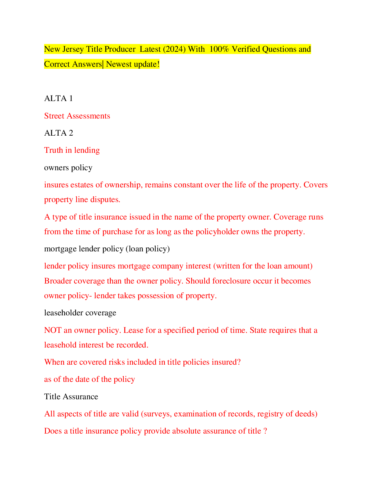 Accounting > QUESTIONS and ANSWERS > New Jersey Title Producer Latest (2024) With 100% Verified Questions and Correct Answers| Newest update