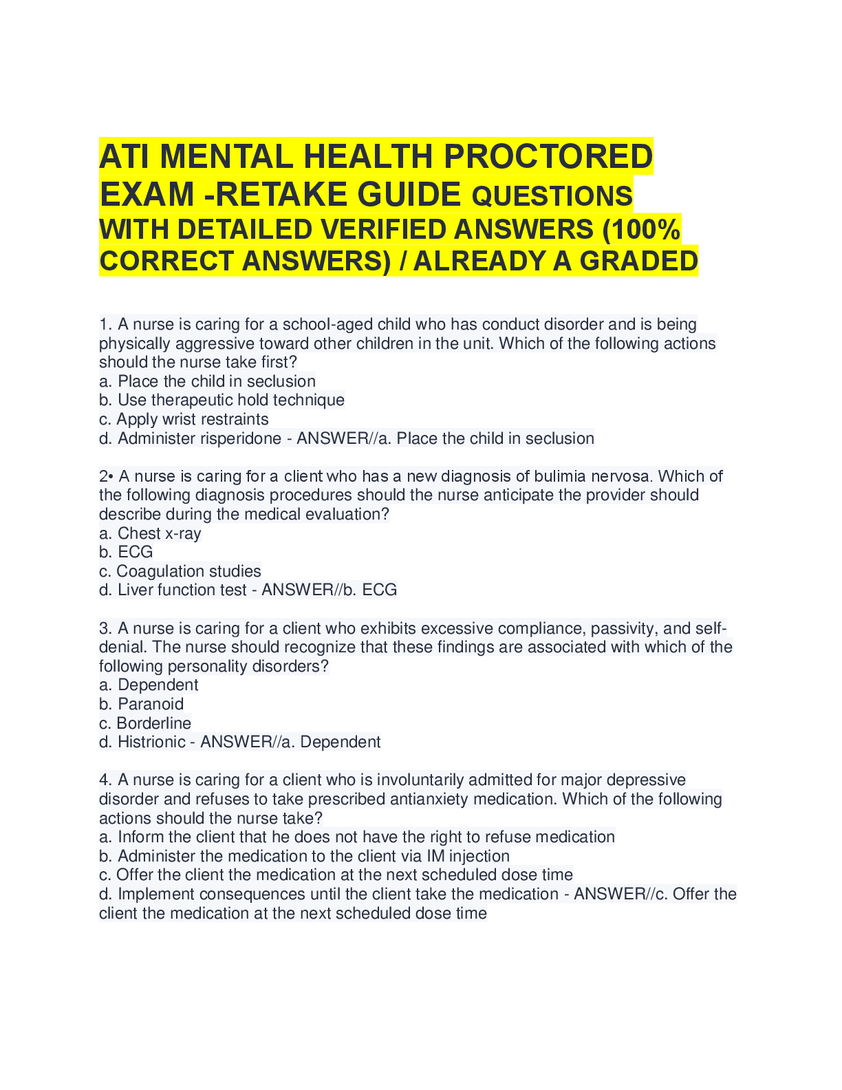Psychiatric Mental Health NCLEX > A-Level Question Paper > ATI Mental Health Proctored Exam Review: 350+ Questions with Detailed Verified Answers | A+ Graded Study Guide