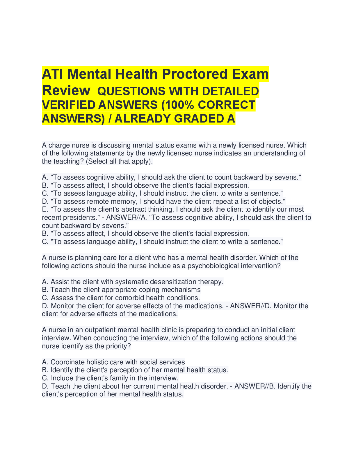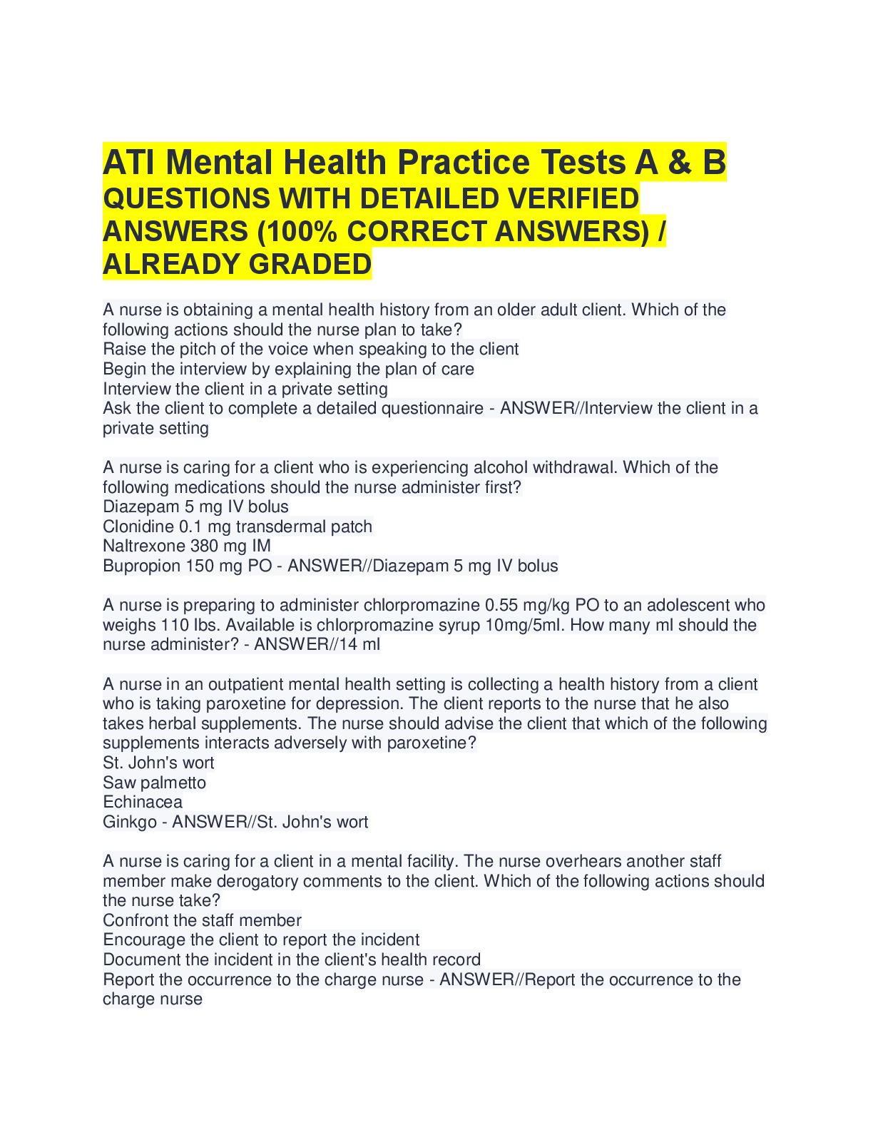 Psychiatric Mental Health NCLEX > A-Level Question Paper > ATI Mental Health Practice Tests A & B: 100+ Questions with Detailed Verified Answers | NCLEX Study Guide