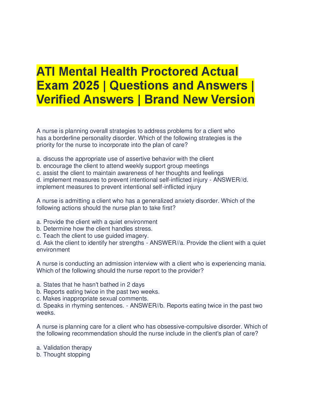 Psychiatric Mental Health NCLEX > A-Level Question Paper > ATI Mental Health Proctored Actual Exam 2025: 100+ Questions & Verified Answers | Brand New Version