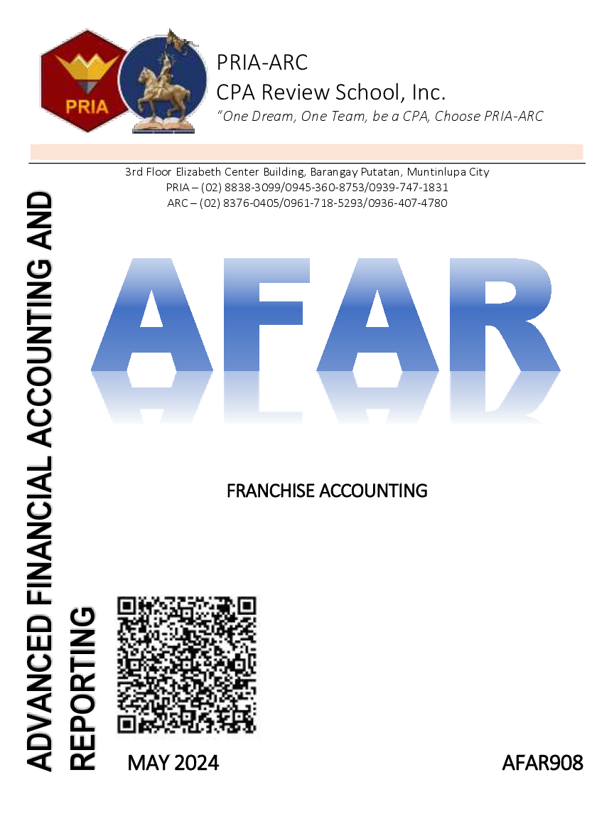 Financial Accounting > COURSE NOTES > Advanced Financial Accounting and Reporting - FRANCHISE ACCOUNTING (IFRS 15) | PRIA-ARC CPA Review School, Inc | Course Notes & Exercises