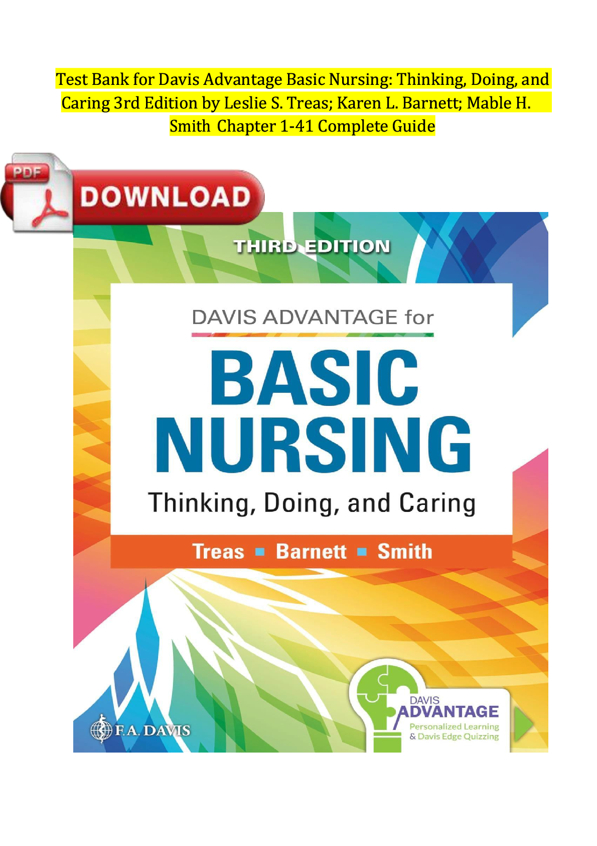 nursing fundamentals > TEST BANKS > Test Bank for Davis Advantage Basic Nursing: Thinking, Doing, and Caring 3rd Edition by Treas, Barnett & Smith | Complete Chapters 1-41 | Verified Questions & Answers | Downloadable PDF