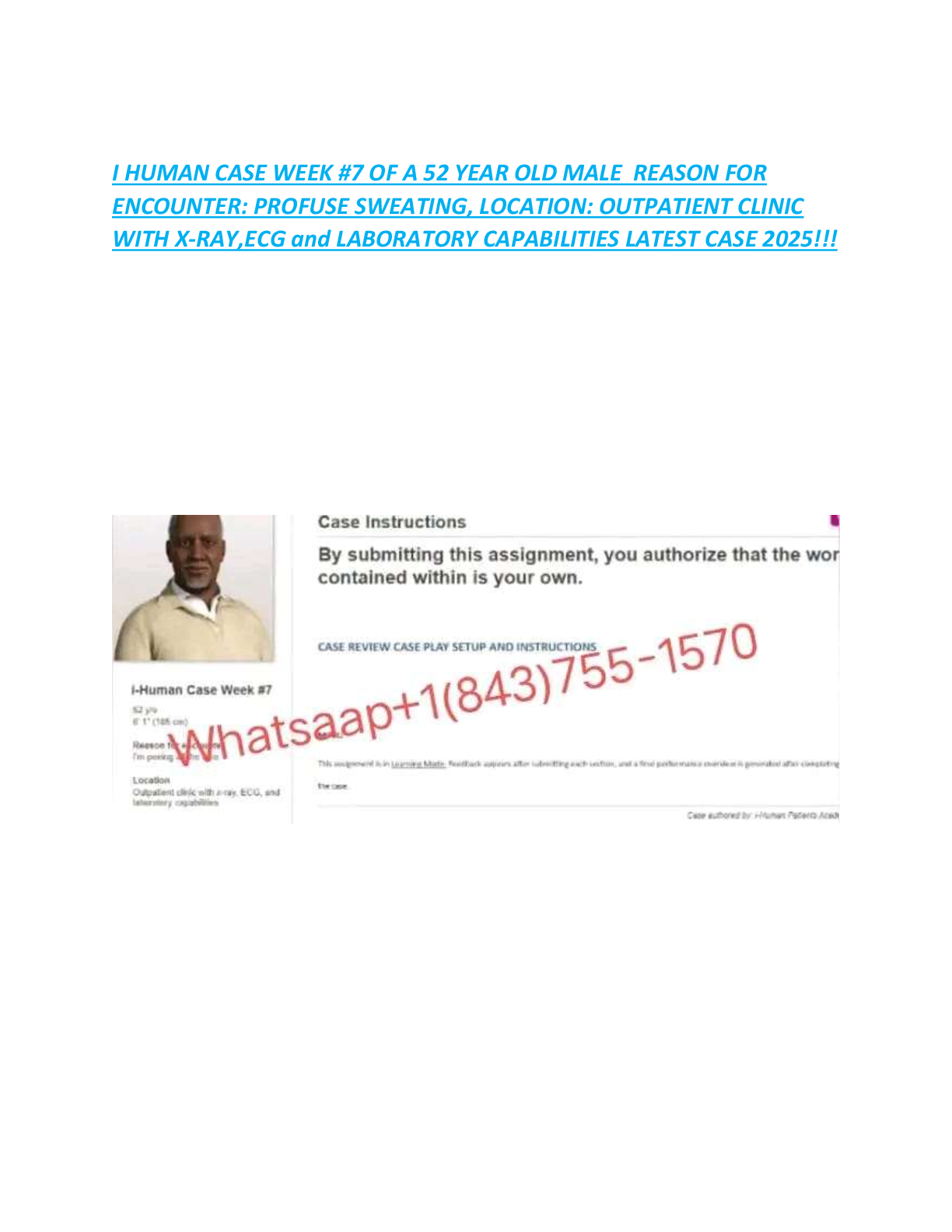 *NURSING > EXAM > I HUMAN CASE WEEK #7 OF A 52 YEAR OLD MALE REASON FOR ENCOUNTER: PROFUSE SWEATING, LOCATION: OUTPATIENT CLINIC WITH X-RAY,ECG and LABORATORY CAPABILITIES LATEST CASE 2025!!!