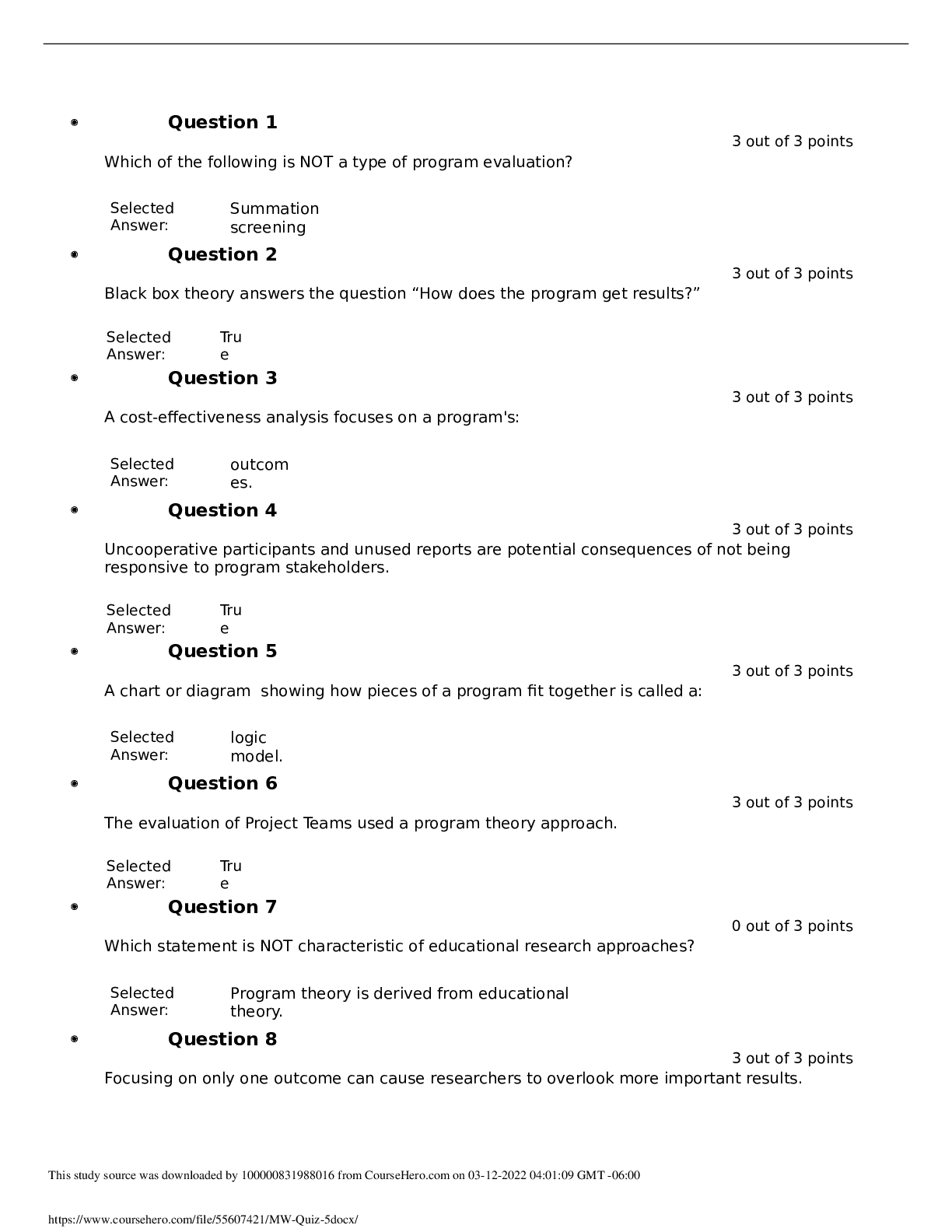 Question 1 3 out of 3 points Which of the following is NOT a type of program evaluation? Selected Answer: Summation screening Question 2 3 out of 3 points Black box theory answers the quest...