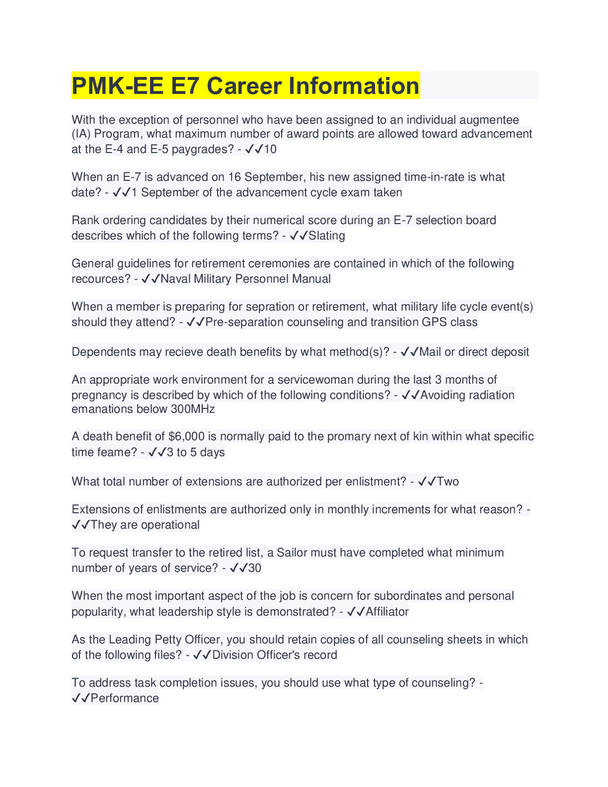 Military Studies > EXAM > PMK-EE E7 Career Information | with COMPLETE SOLUTION (All)