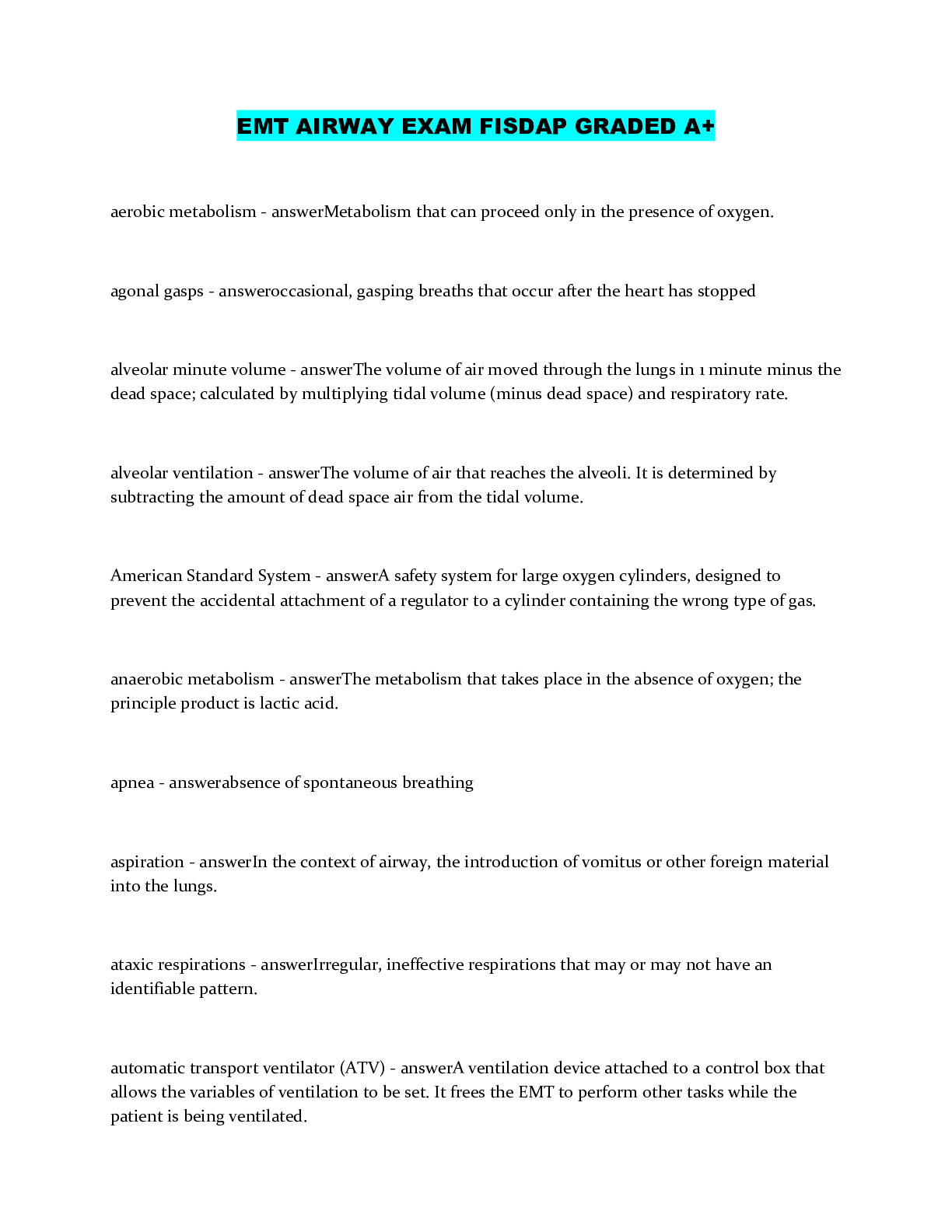 EMT FISDAP, COMPREHENSIVE ,AND AIRWAY BUNDLED EXAM WITH COMPLETE SOLUTION GRADED A+...