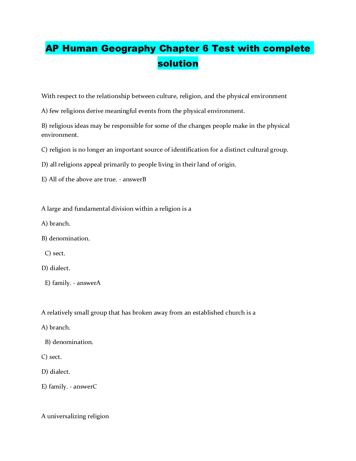 AP HUMAN GEOGRAPHY CHAPTER 1,2,3,4,5,6,7,8 BUNDELED EXAMS WITH COMPLETE SOLUTION...