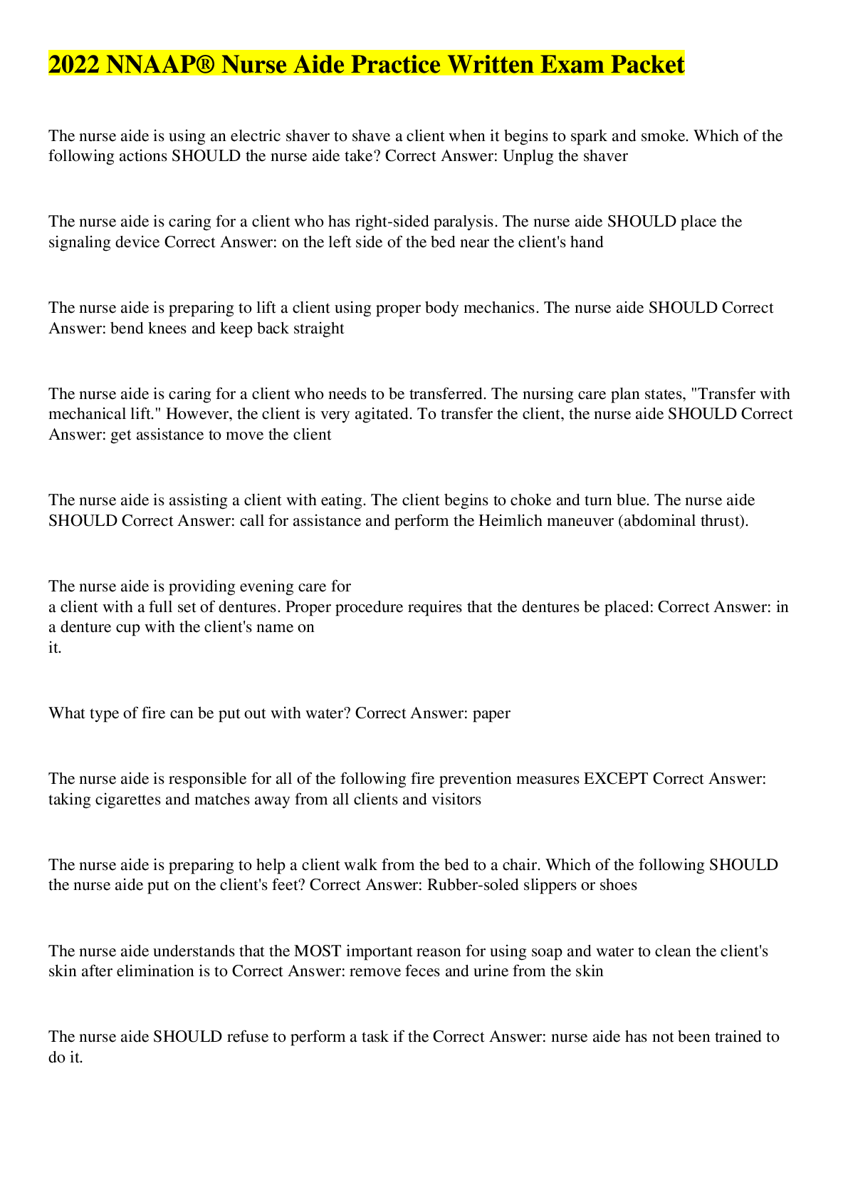 Health Care > EXAM > CNA Practice Test (NNAAP) 2022/23 with COMPLETE SOLUTION (All)