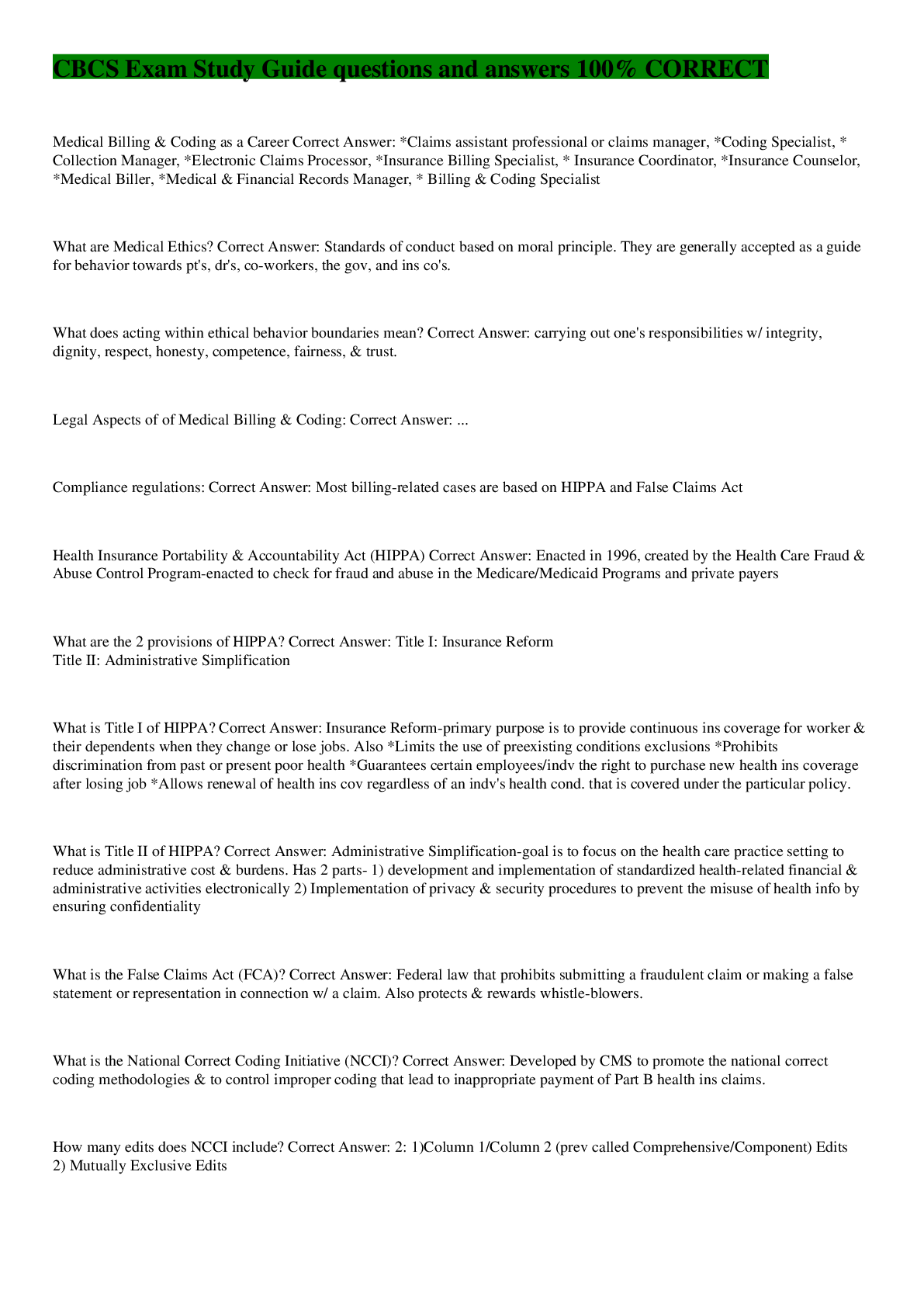 When was the Health Information and Accountability Act (HIPAA) created? Correct Answer: 1996 What are Medical Ethics? Correct Answer: Standards of conduct based on moral principals. What are the two...