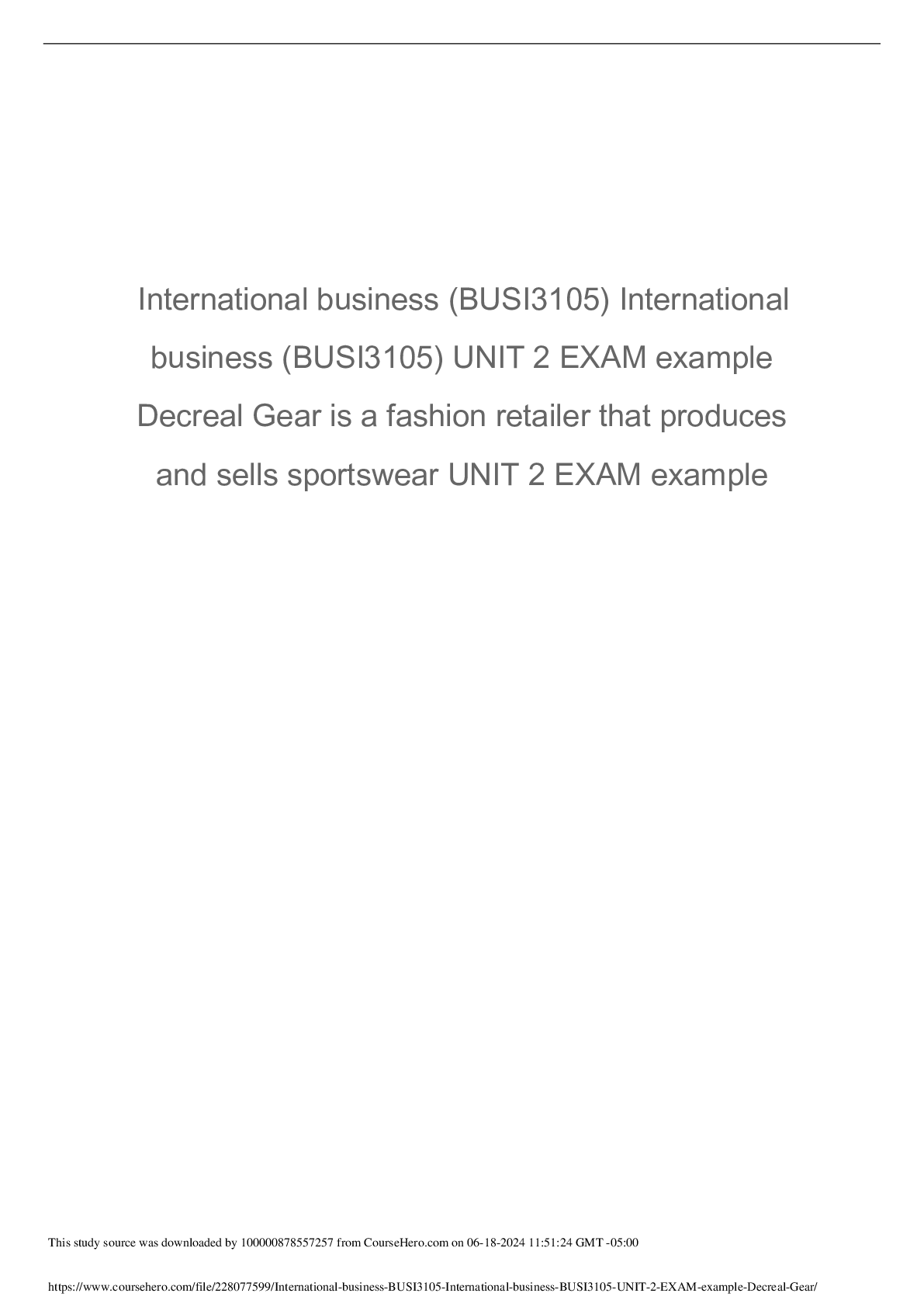 *NURSING > EXAM > International business (BUSI3105) International business (BUSI3105) UNIT 2 EXAM example Decreal Gear is a fashion retailer that produces and sells sportswear UNIT 2 EXAM example