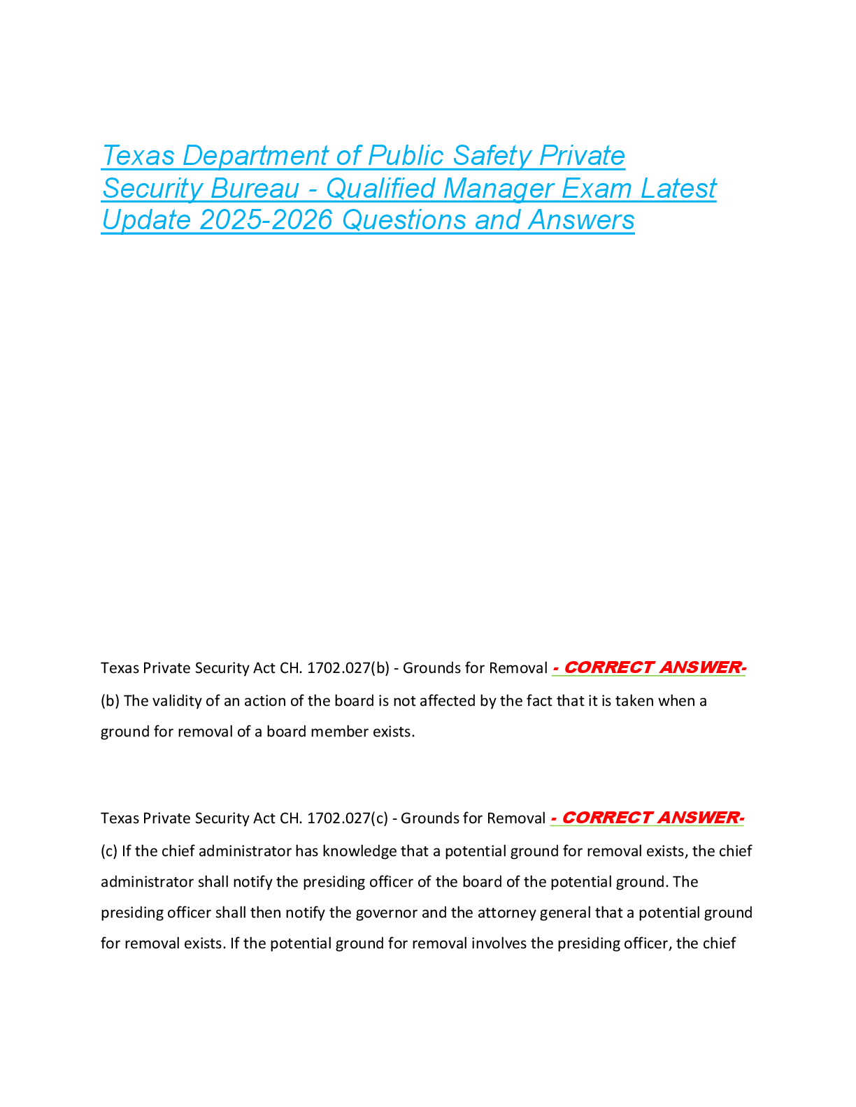 *NURSING > EXAM > Texas Department of Public Safety Private Security Bureau - Qualified Manager Exam Latest Update 2025-2026 Questions and Answers