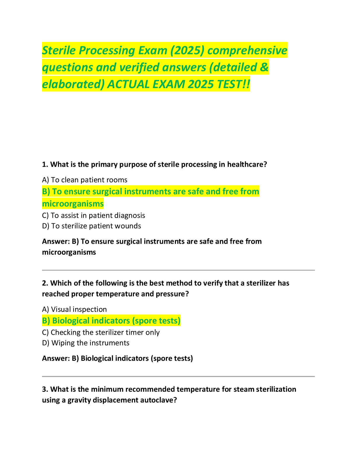 *NURSING > EXAM > Sterile Processing Exam (2025) comprehensive questions and verified answers (detailed & elaborated) ACTUAL EXAM 2025 TEST!!