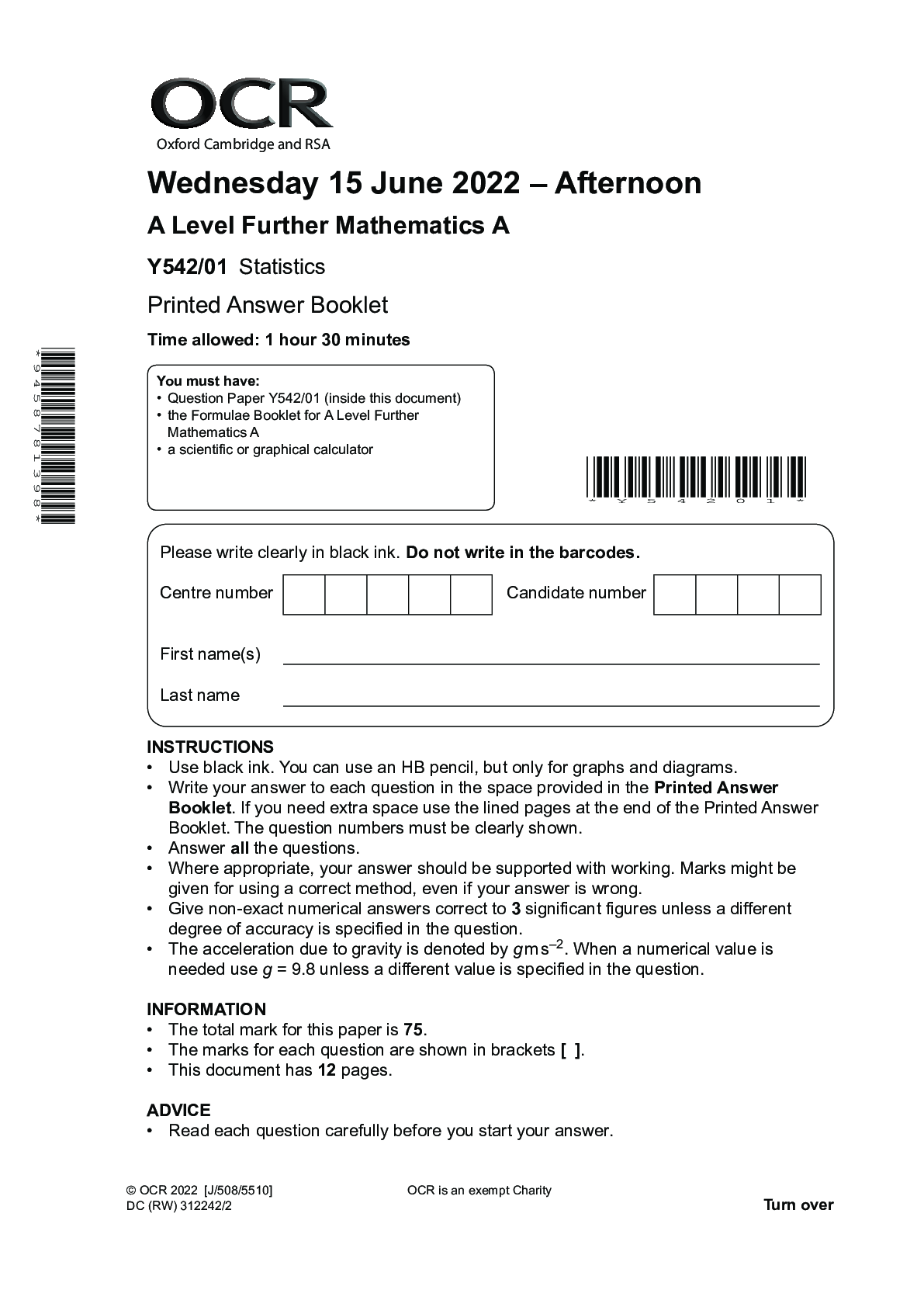 Mathematics > A-Level Question Paper > OCR A LEVEL JUNE 2022 FURTHER MATHS A STATISTICS ANSWER BOOKLET