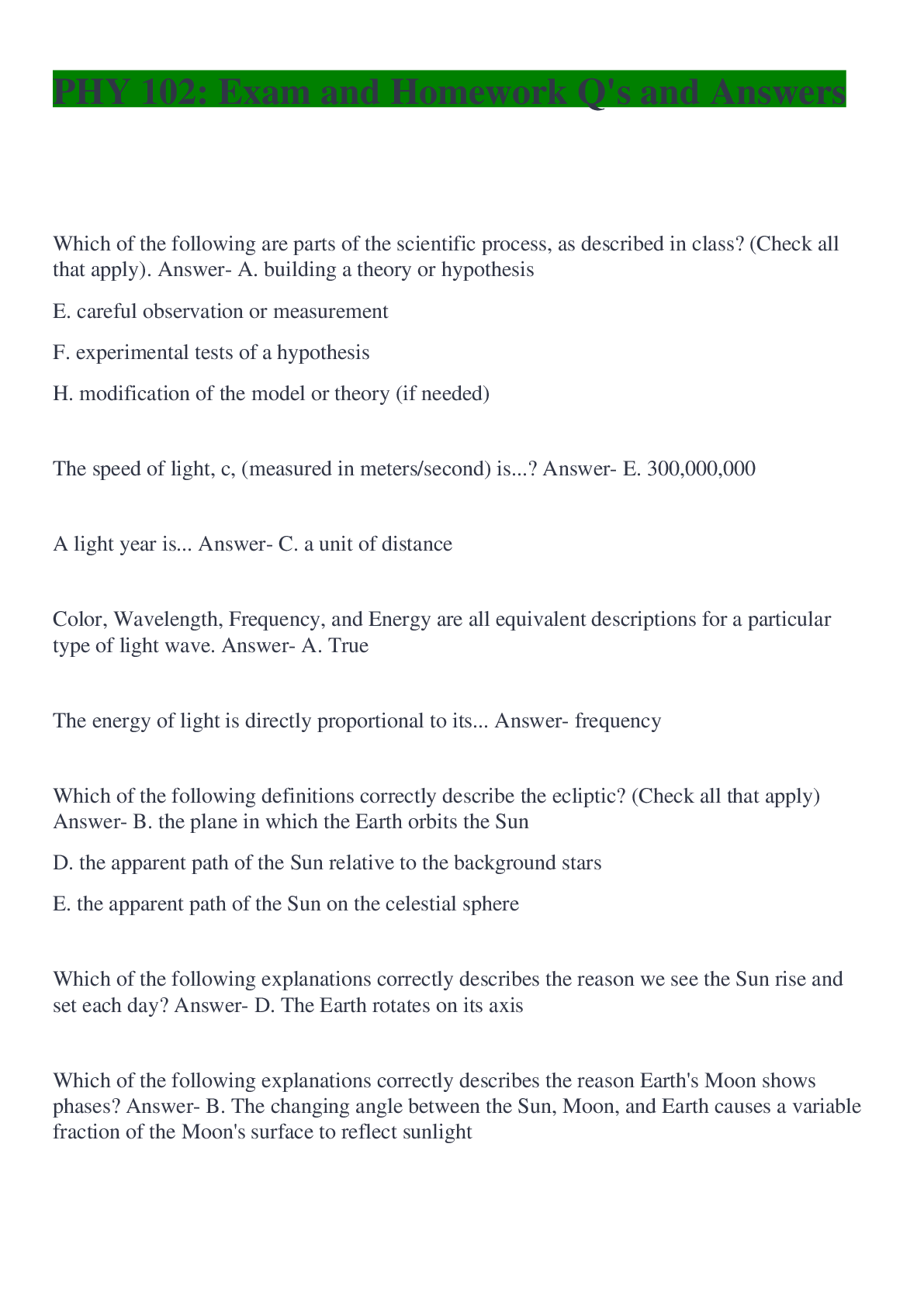 Biology > STUDY GUIDE > PHY 102: Exam and Homework Q's and Answers