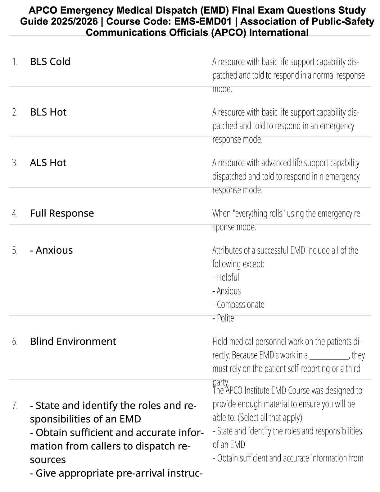 *NURSING > STUDY GUIDE > APCO Emergency Medical Dispatch (EMD) Final Exam Questions Study Guide 2025/2026 | Course Code: EMS-EMD01 | Association of Public-Safety Communications Officials (APCO) International