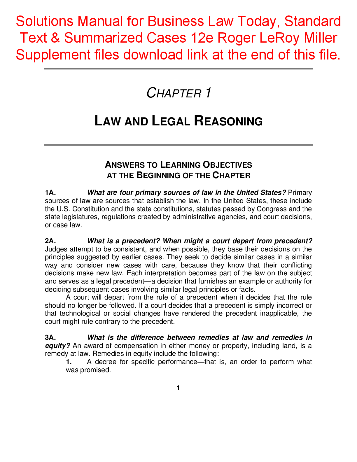 Business Law > eBook-PDF > Solutions Manual for Business Law Today, Standard Text & Summarized Cases 12e Roger LeRoy Miller