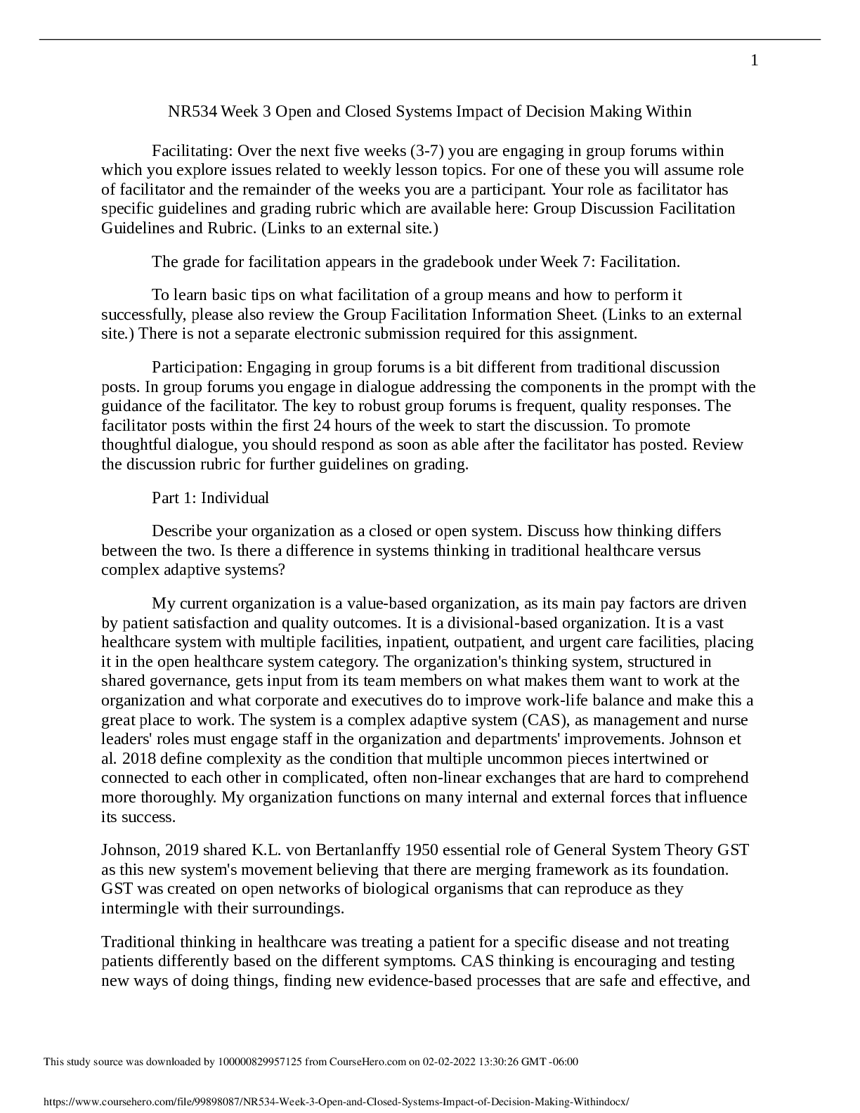 *NURSING > DISCUSSION POST > NR 534 Week 3 Discussion: Open and Closed Systems Impact of Decision Making Within | Download To Score An A