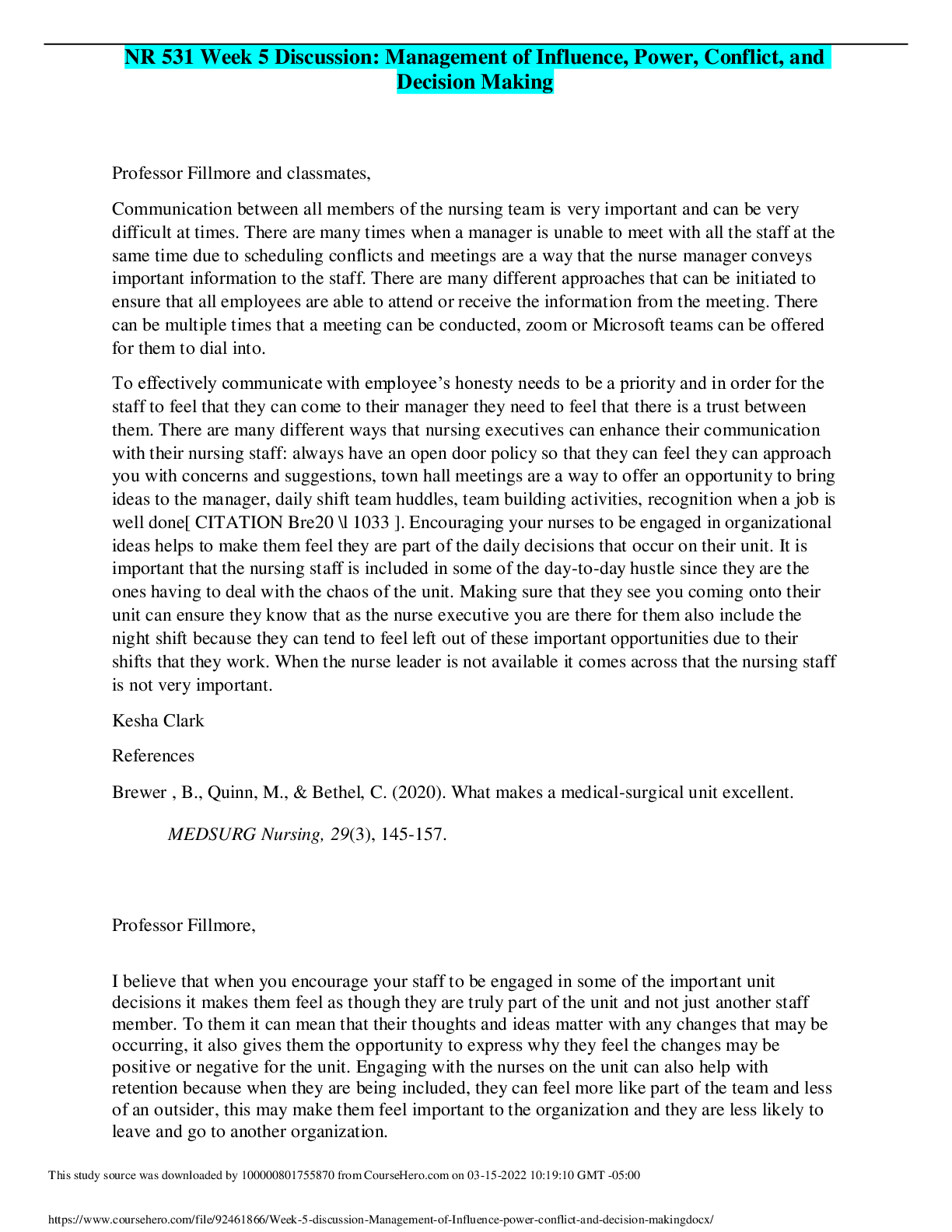 *NURSING > DISCUSSION POST > NR 531 Week 5 Discussion: Management of Influence, Power, Conflict, and Decision Making (GRADED)