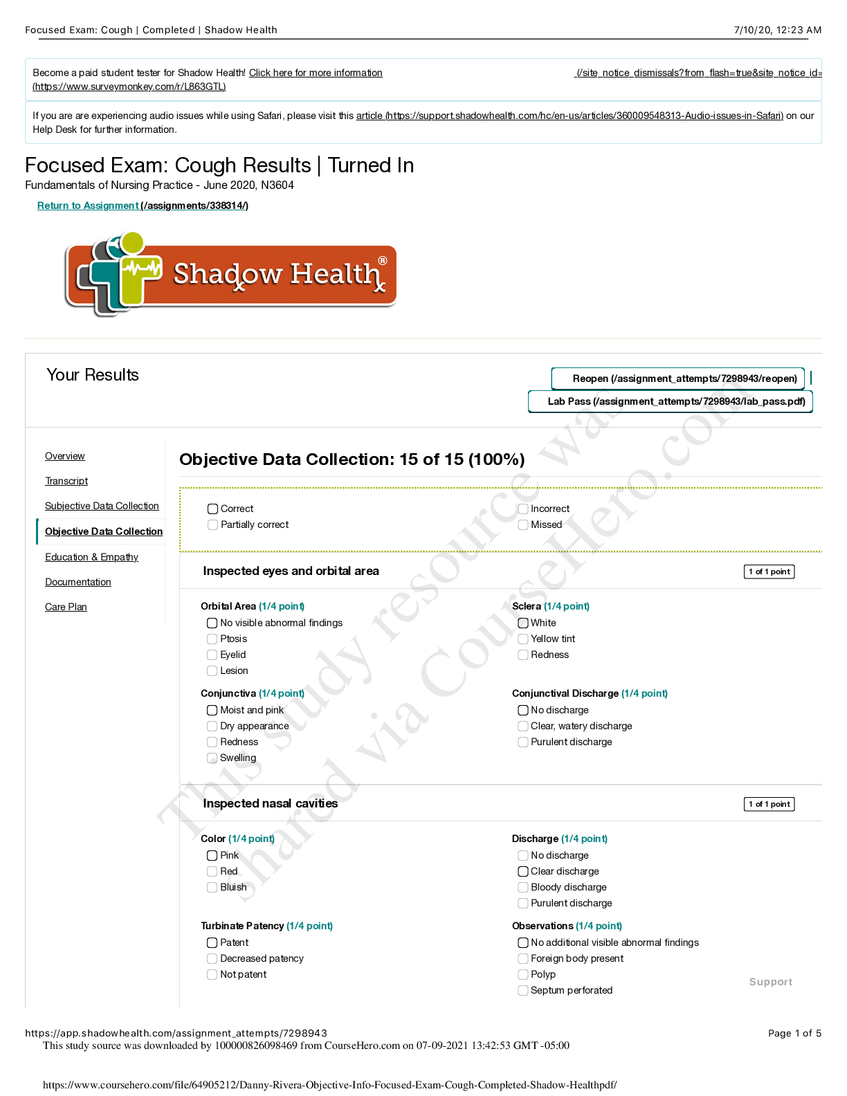 *NURSING > SHADOW HEALTH > NUR 3010Danny Rivera Focused Exam_ Cough _ Completed _ Shadow Health Objective