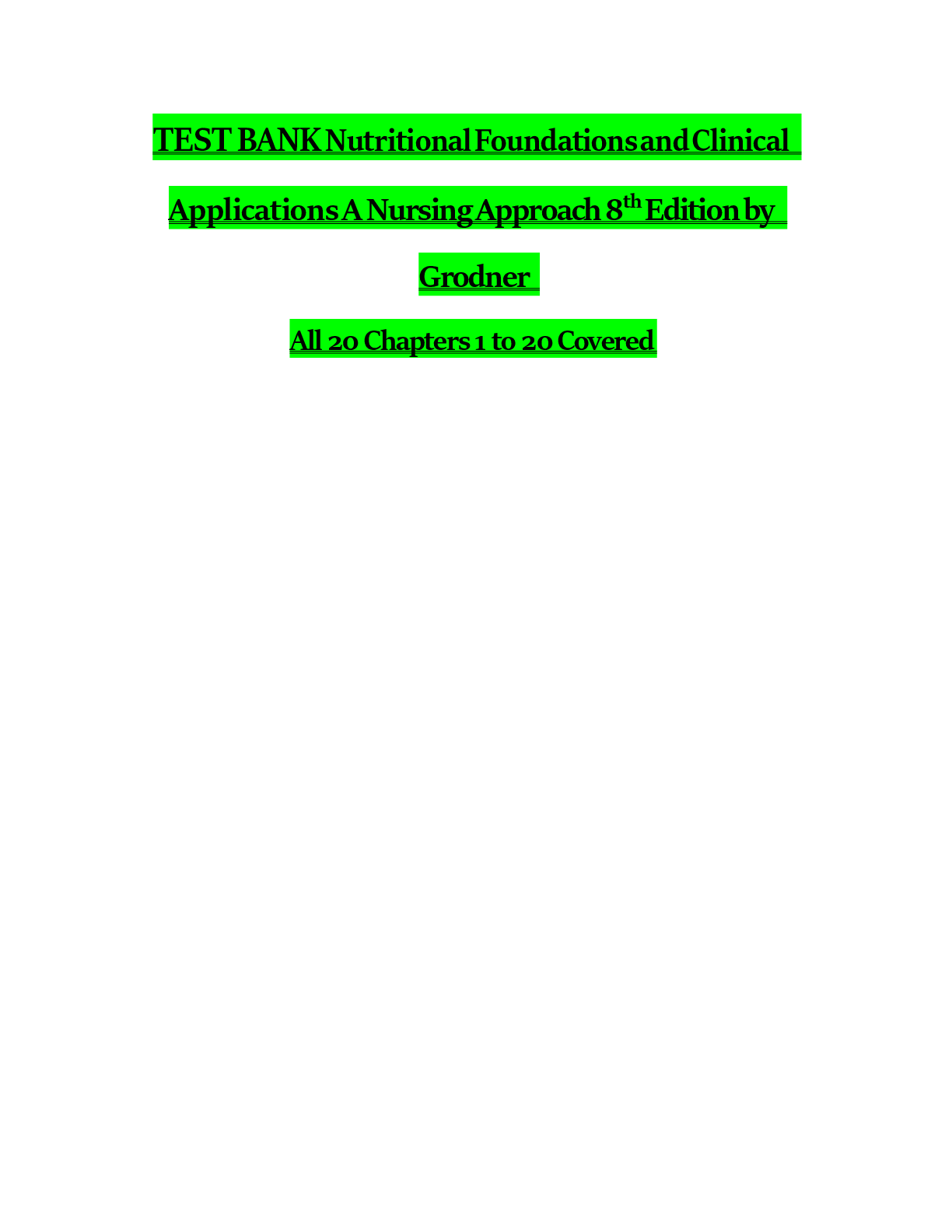 Nutrition > TEST BANKS > Test Bank for Nutritional Foundations and Clinical Applications: A Nursing Approach, 8th Edition by Grodner, Escott-Stump & Dorner | ISBN: 9780323810241 | Verified Chapters 1-20 | NGN-Style Q&A | Downloadable PDF