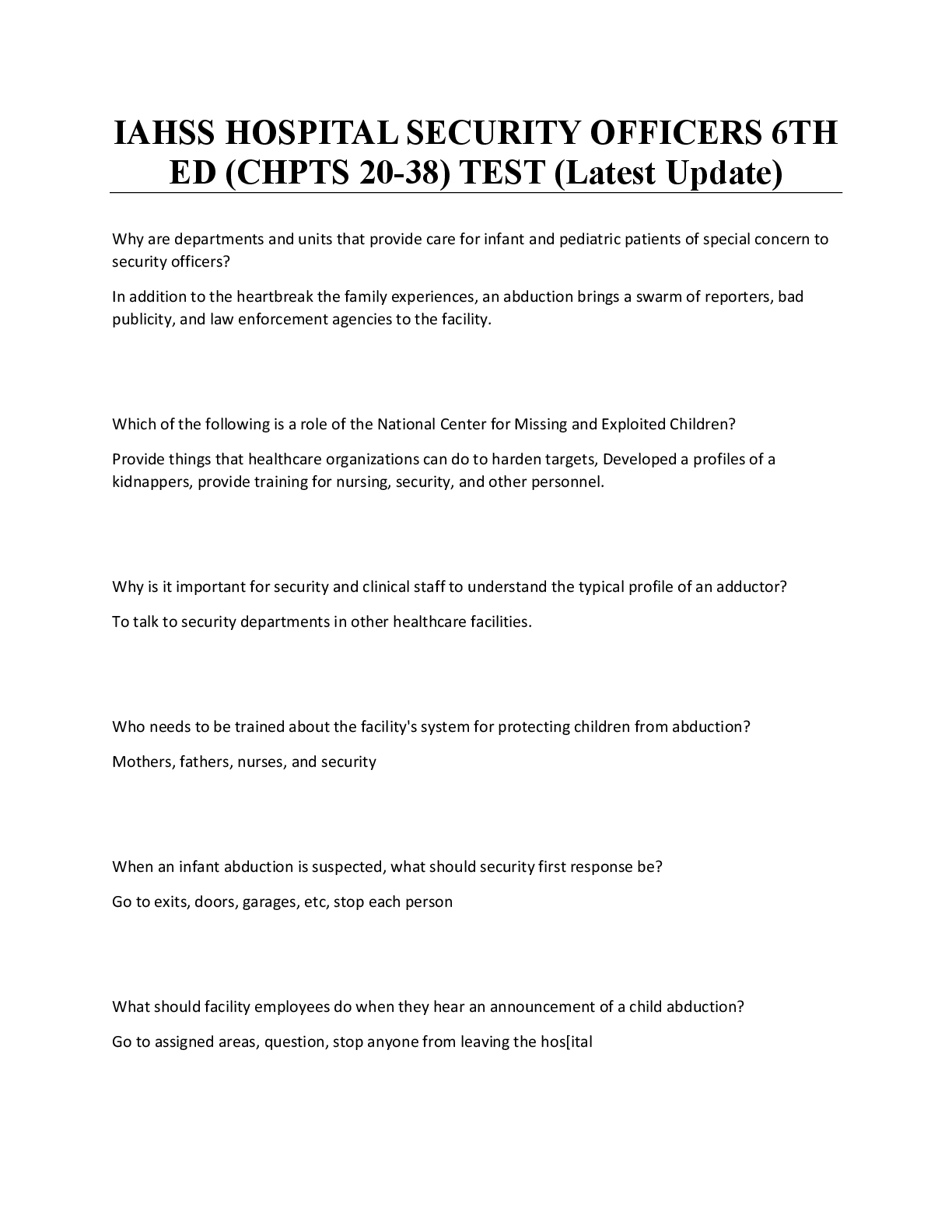 *NURSING > QUESTIONS and ANSWERS > IAHSS Hospital Security Officers 6th Ed (Chpts 20–38) Test – Questions and Answers (Latest Update)