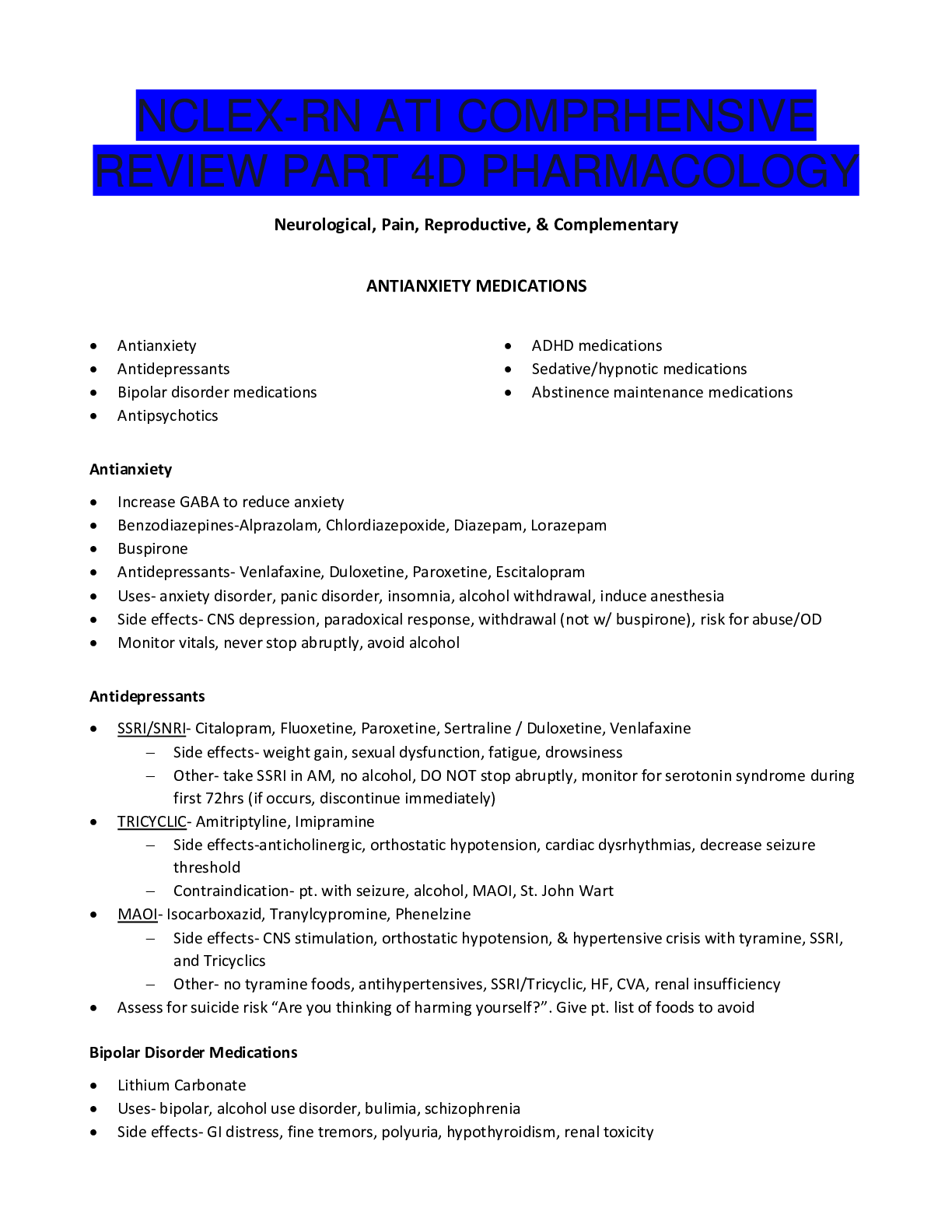 *NURSING > NCLEX > NCLEX RN ATI COMPRHENSIVE REVIEW PART 4D PHARMACOLOGY-LATEST 2021