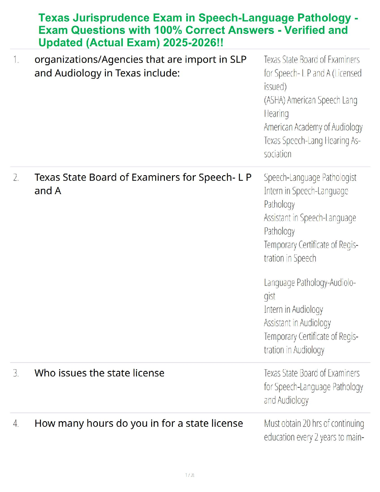 Pathology > QUESTIONS & ANSWERS > Texas Jurisprudence Exam in Speech-Language Pathology - Exam Questions with 100% Correct Answers - Verified and Updated (Actual Exam) 2025-2026!!
