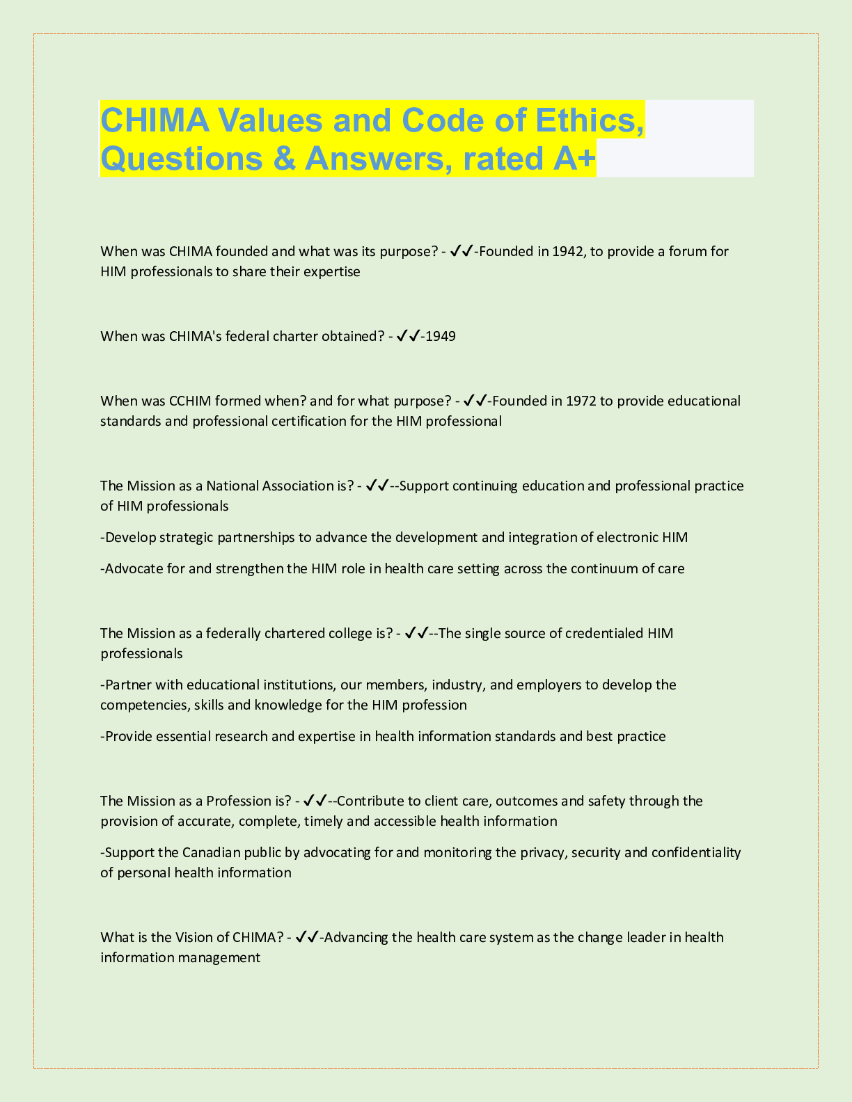 Social Sciences > QUESTIONS & ANSWERS > CHIMA Values and Code of Ethics, Questions & Answers, rated A+