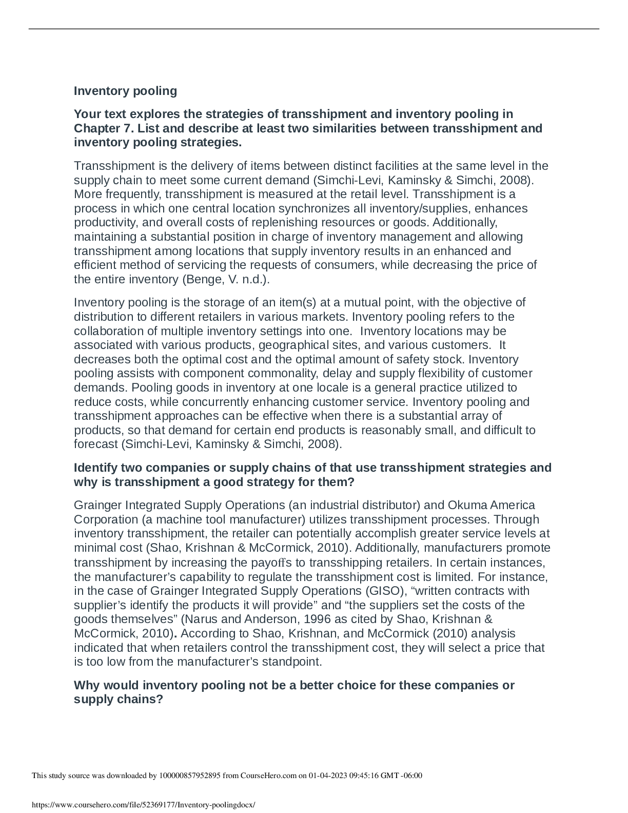 Marketing > QUESTIONS & ANSWERS > Inventory pooling: Your text explores the strategies of transshipment and inventory pooling in Chapter 7. List and describe at least two similarities between transshipment and inventory pooling strategies., Identify two companies or supply chains of that use transshipment strategies and why is transshipment a good strategy for them?, Why would inventory pooling not be a better choice for these companies or supply chains?