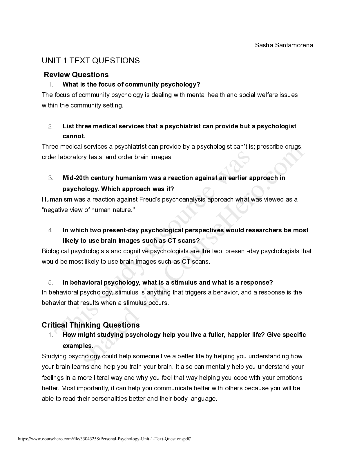 Psychology > QUESTIONS & ANSWERS > PSYCHOLOGY 101 Personal Psychology- Unit 1 Text Questions, Review Questions & Critical Thinking Questions