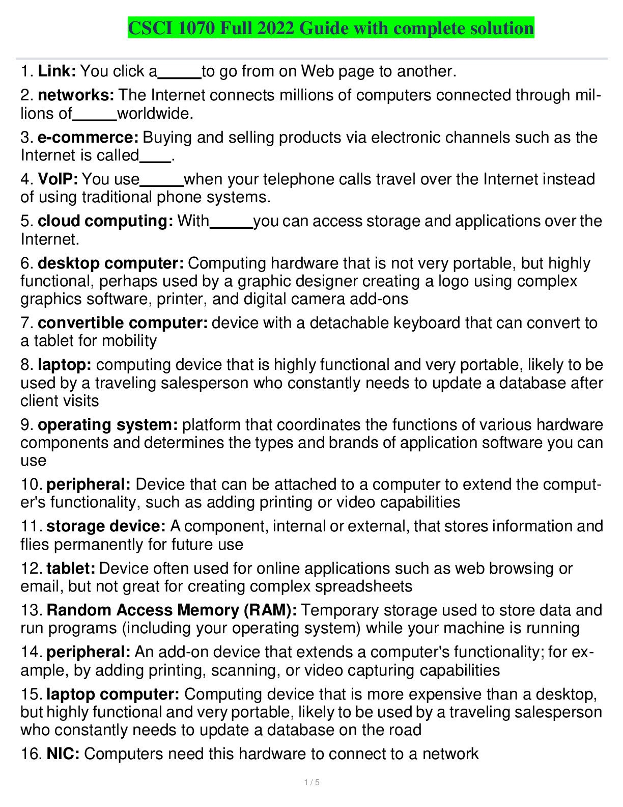 Computer Science > QUESTIONS & ANSWERS > CSCI 1070 Full 2022 Guide with complete solution
