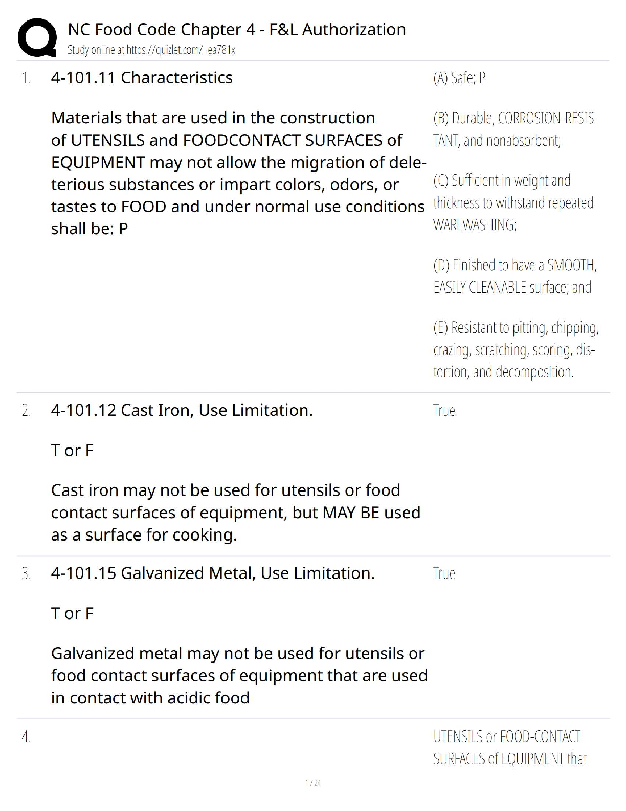 *NURSING > QUESTIONS & ANSWERS > NC Food Code Chapter 4 / Equipment & Utensils / F&L Authorization / Score 100% / 2025 Update