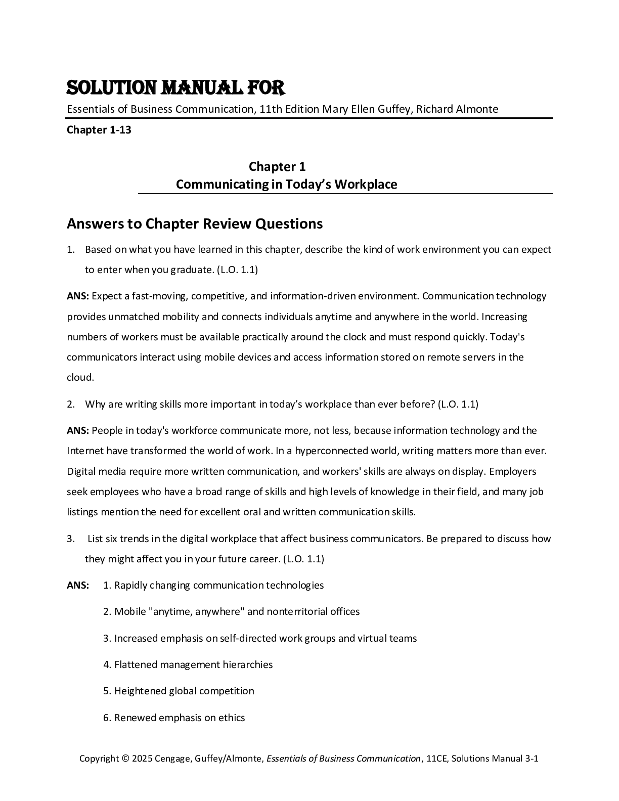 Business > SOLUTIONS MANUAL > Solution Manual For Essentials of Business Communication, 11th Edition Mary Ellen Guffey, Richard Almonte Chapter(1-13)