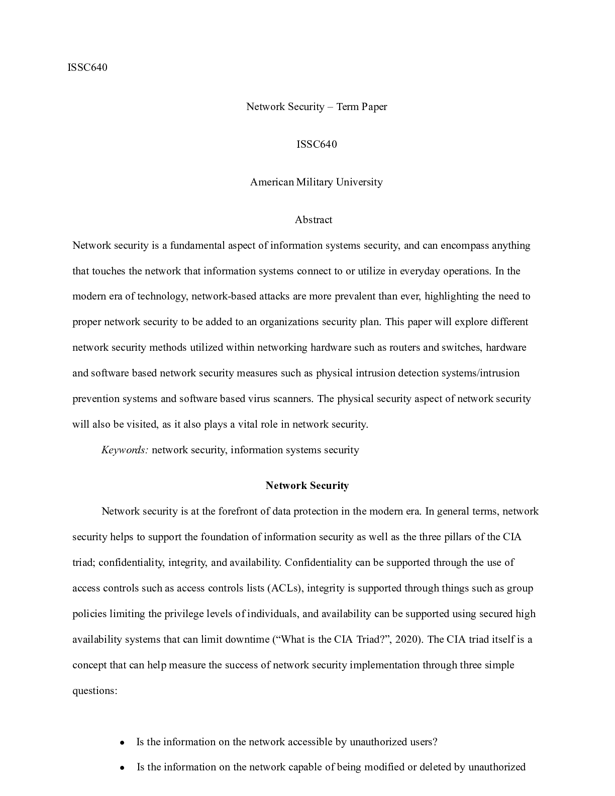 Business > CASE STUDY > ISSC640 Paper.docx ISSC640 Network Security “ Term Paper ISSC640 American Military