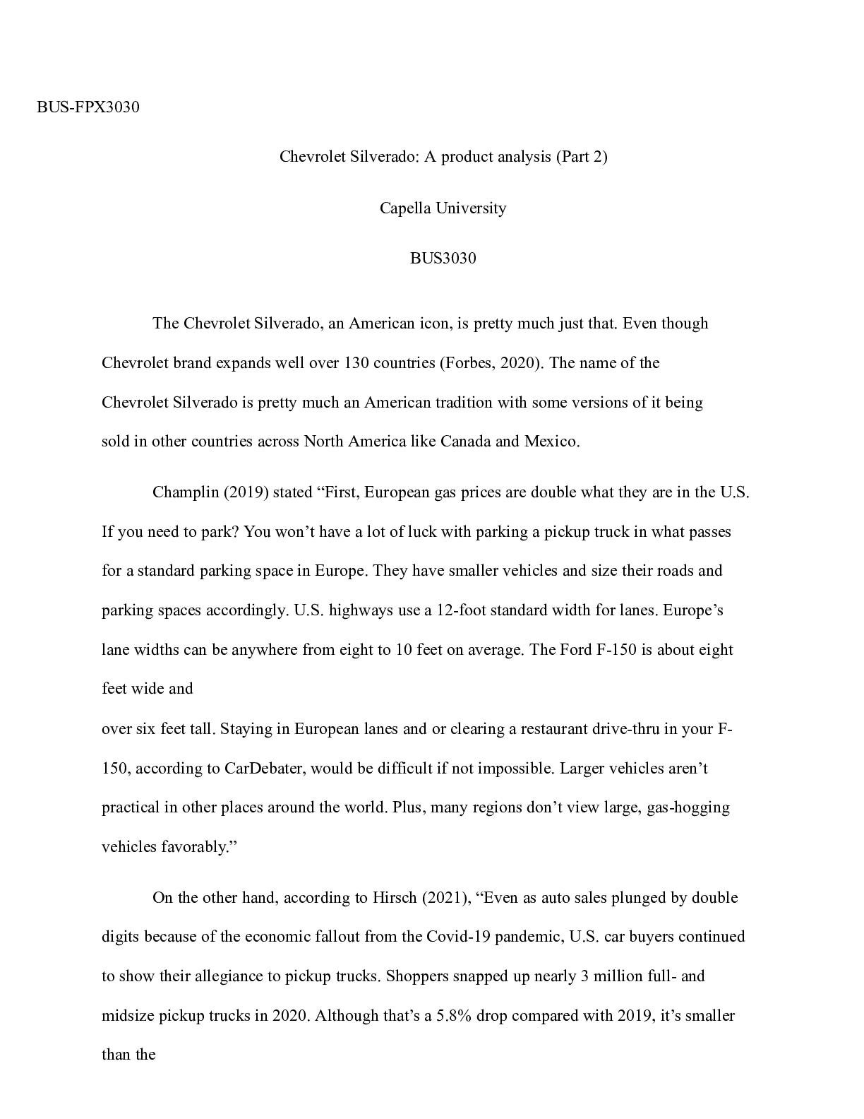Business > CASE STUDY > BUS3030 week 5 Paper.docx BUS-FPX3030 Chevrolet Silverado: A product analysis (Part 2)