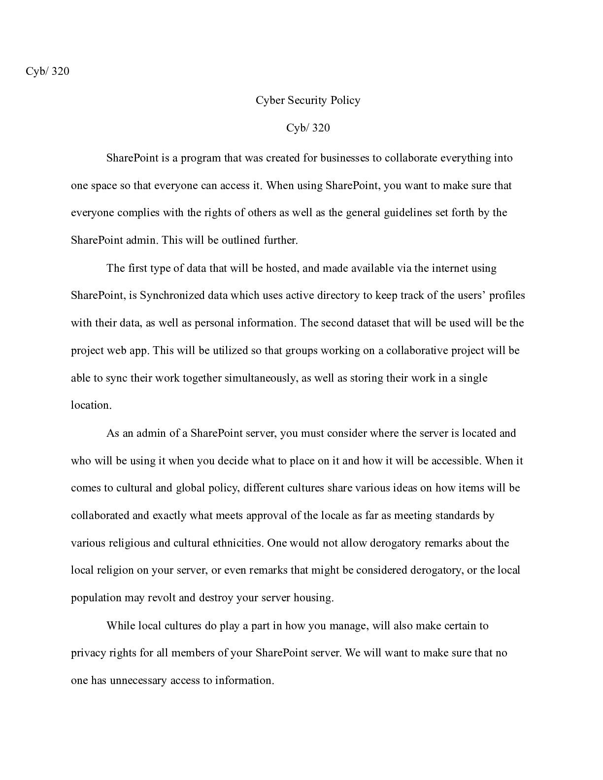 Business > CASE STUDY > Cyber Security Policy.docx Cyb/ 320 Cyber Security Policy Cyb/ 320 SharePoint is a prog