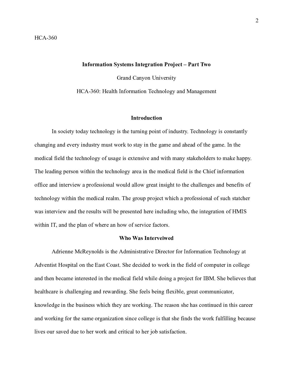 Business > CASE STUDY > Week_4_Part_2_Paper.docx HCA-360 Information Systems Integration Project “ Part Two Gra