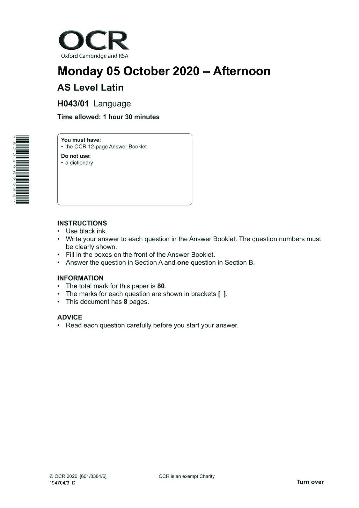 Latin > Higher Education > AS Level Latin_H043/01 Question Paper Nov 2020 | Language