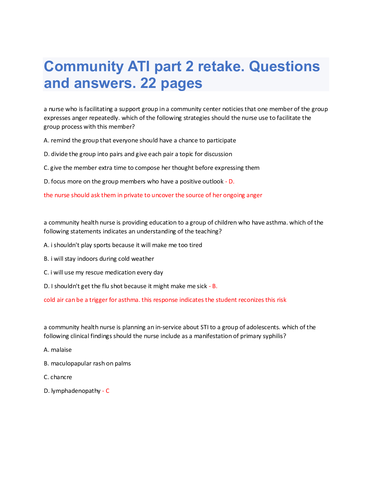 *NURSING > Other Study Resources. > Community ATI part 2 retake. Questions and answers. 22 pages