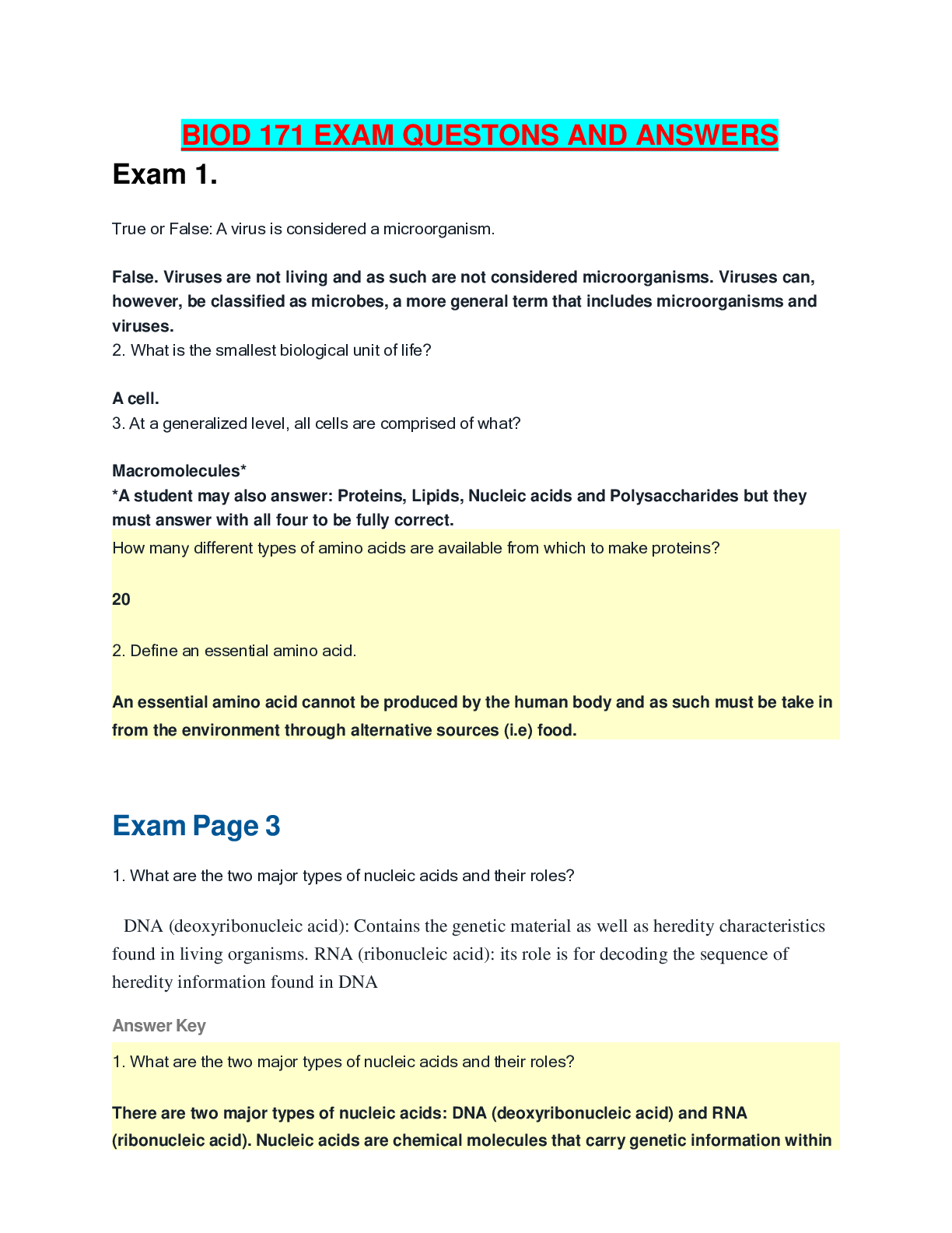 *NURSING > Other Study Resources. > PORTAGE LEARNING BIOD 171 EXAM QUESTIONS AND ANSWERS.