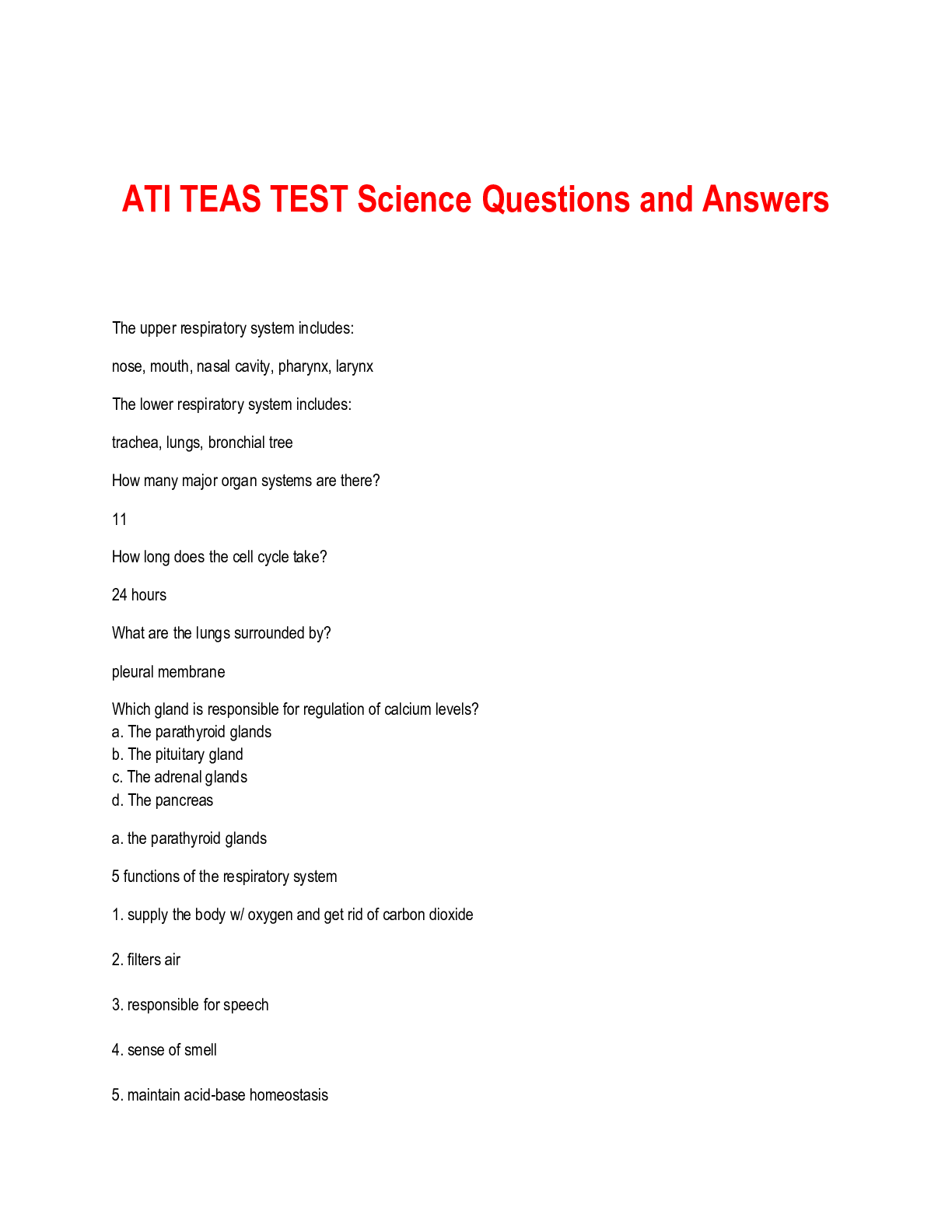 *NURSING > Other Study Resources. > ATI TEAS 6 - Science Section 1.2 - Human Anatomy and Physiology - The Respiratory System