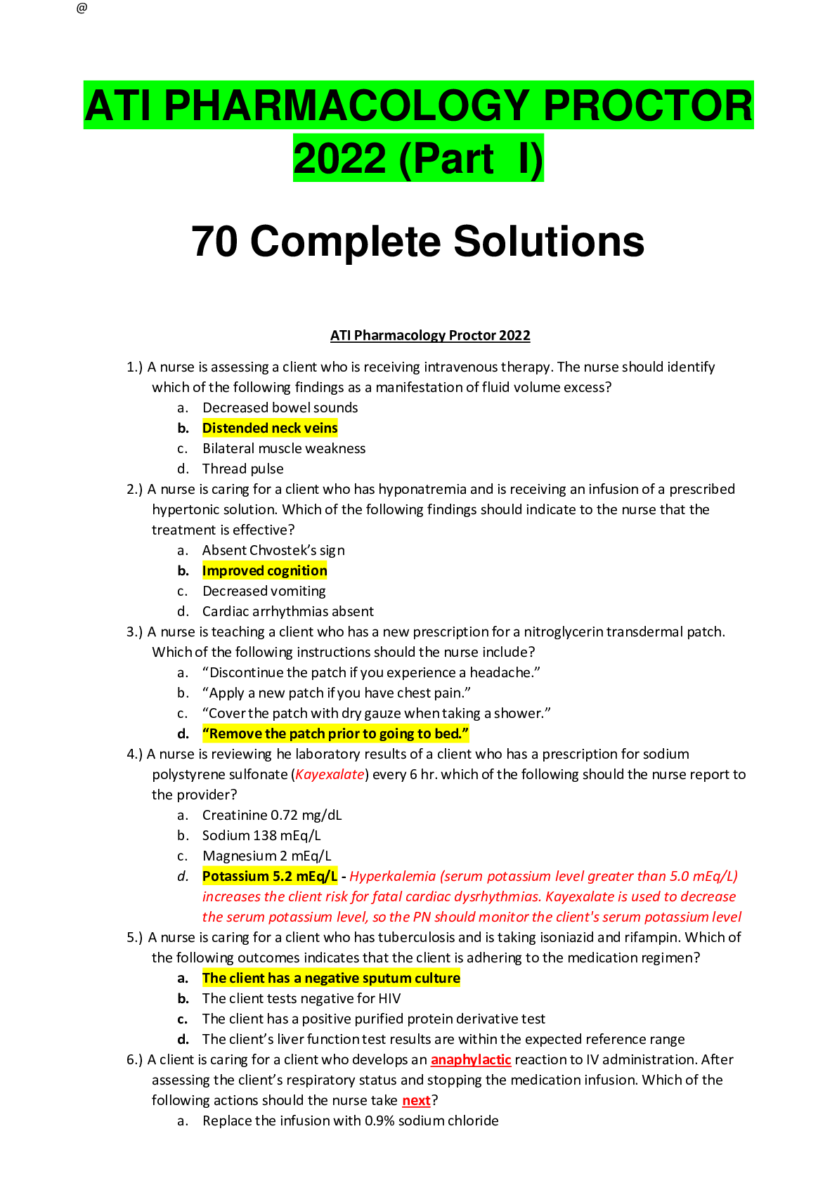 *NURSING > Other Study Resources. > ATI PHARMACOLOGY PROCTOR 2022 (Part I)