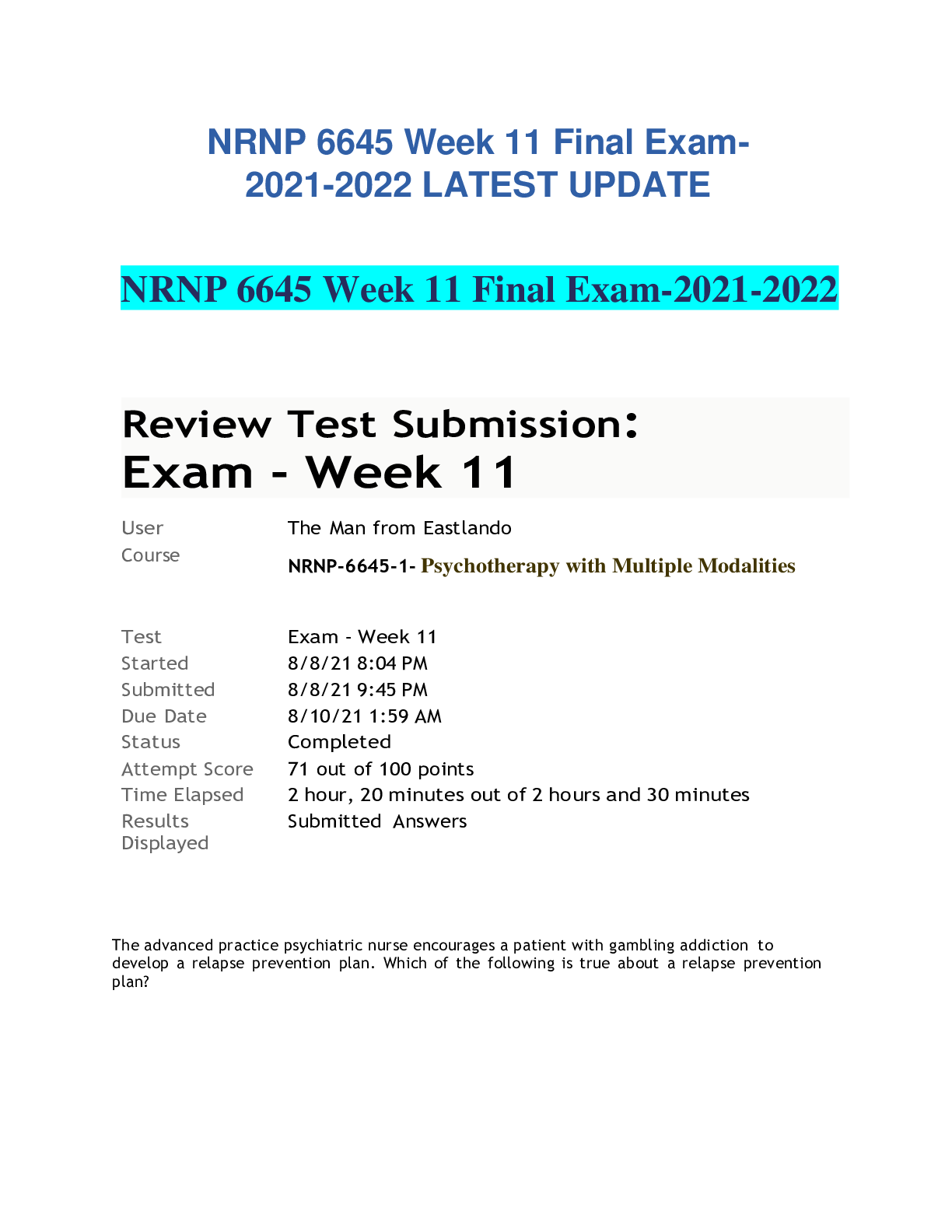 Health Care > ANSWERS AND COMMENTARIES > NRNP 6645 Week 11 Final Exam- 2021-2022 LATEST UPDATE